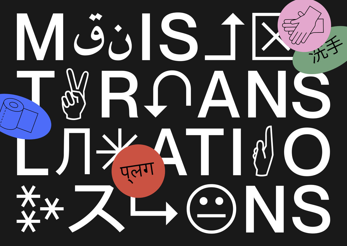 Our identity playfully engages with the concept of mistranslation. We did this by harnessing and distorting the universal language of symbolism. In motion, the Mistranslations wordmark becomes impossible to read as mismatched symbols and letters from different alphabets tick over, while bespoke sticker icons pile up to reference the overload of confusing messaging seen throughout the COVID-19 pandemic. The bespoke sticker icons were carried through to exhibition signage and were used to indicate which posters were sold on the night. Complimented by a striking, bright colour palette, the identity intrigued creatives looking to take part and excited our exhibition audience.