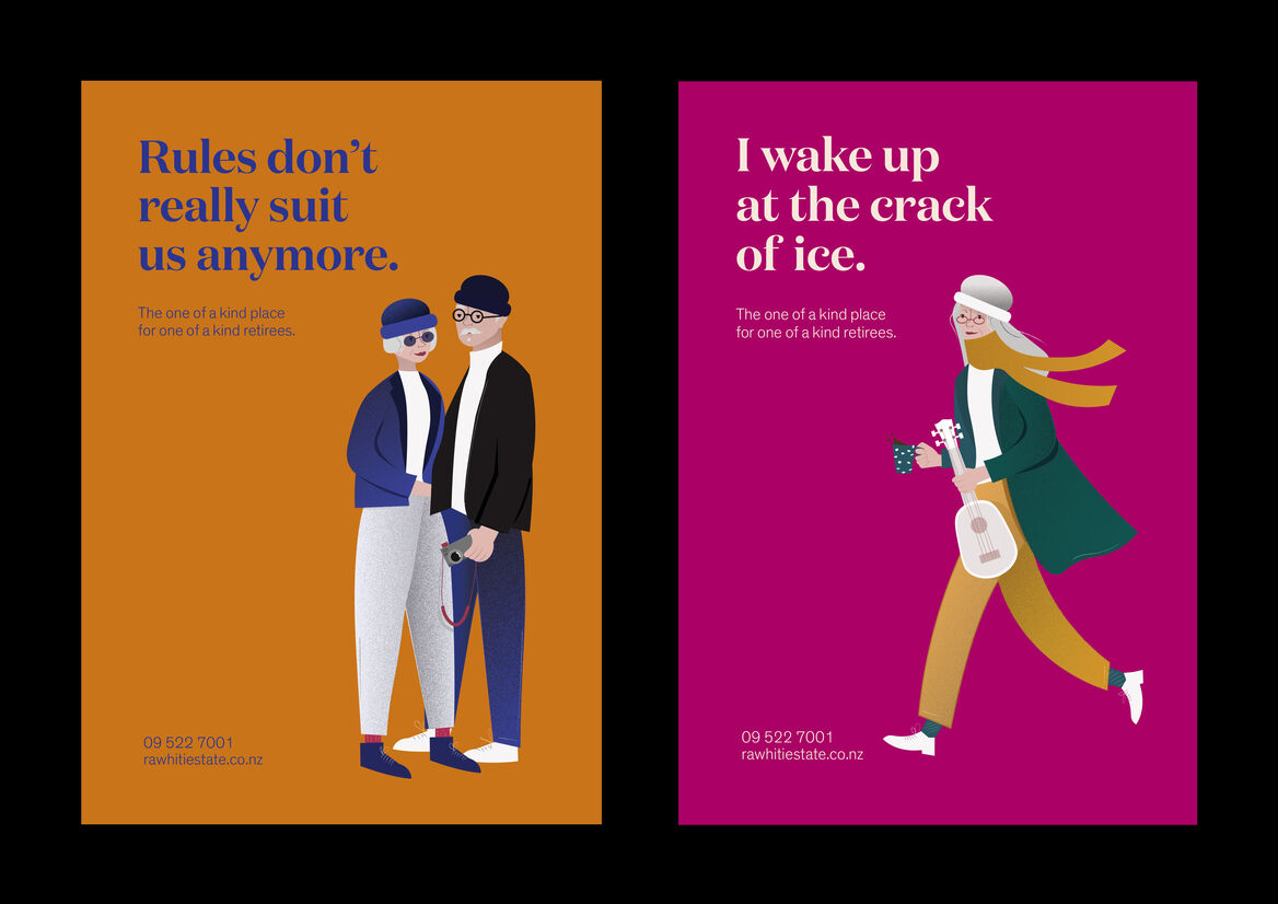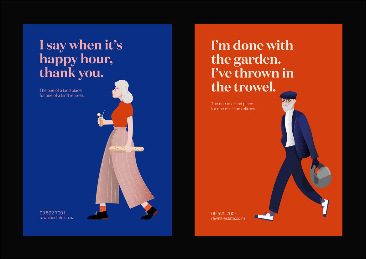 Taking a completely different approach to every other retirement village in the market, we decided to illustrate our characters instead of photographing hired talent. By not photographing our characters, we eliminated the need to fabricate the elaborate visual folly that comes with scouting talent, curating their garments, dressing them, and so on. It enabled us to stay truer to the essence of the conversations we had with Rawhiti Estate’s residents.