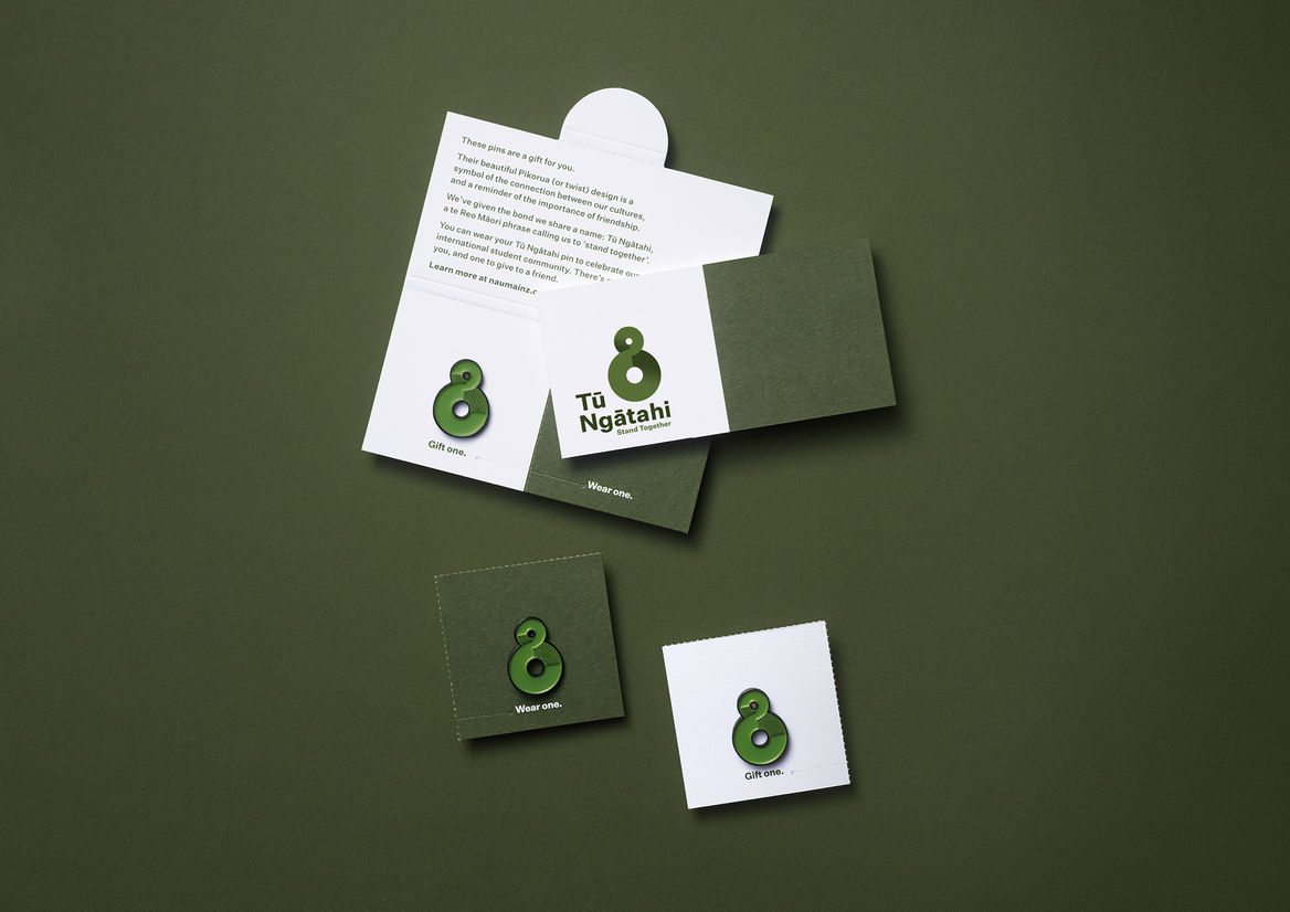 Inspired by our pounamu, enamel pins were created as symbols of support, and distributed to international students and industry representatives nationwide. The pins were housed in packs of two. Recipients were asked to wear one and gift one to a friend, further illustrating our support for each other.