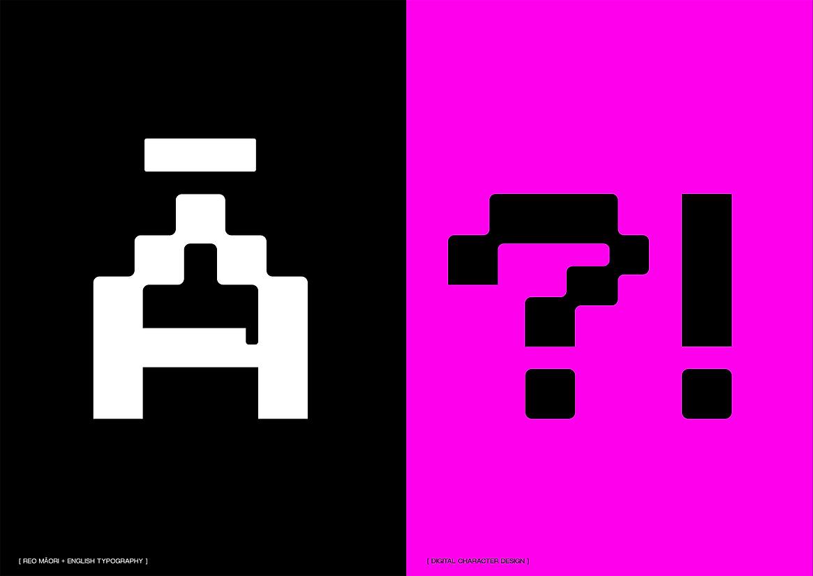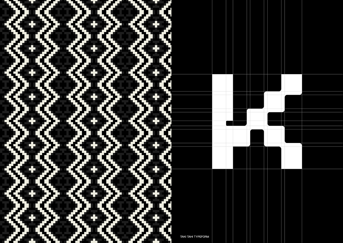 This inspired us to look within Taki Tahi weaving methodologies. The simple grid found in takitahi informed our digital woven patterns, which we used to devise a unique type face in both Te Reo Māori and English.
