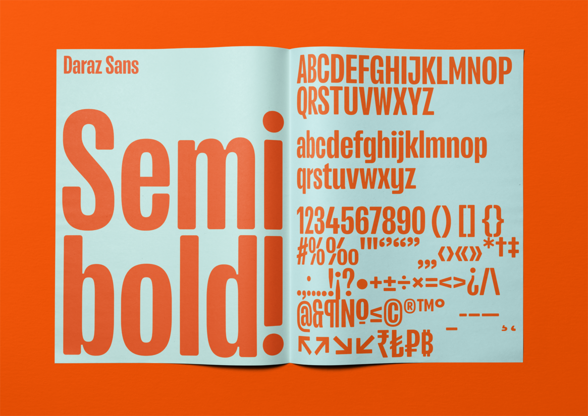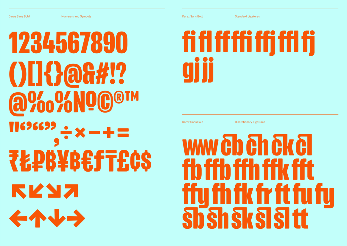 Daraz Sans embodies a warm but idiosyncratic flavour resulting in a unique typographic texture developed for headline use and large contexts. Its strong personality is characterised by its narrow proportions, tight terminals and spacing, compact ascenders / descenders, consistent vertically, and soft outer corners — with a few details borrowed from old enamel road signs to make it stand out.