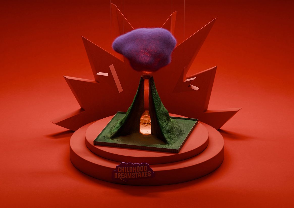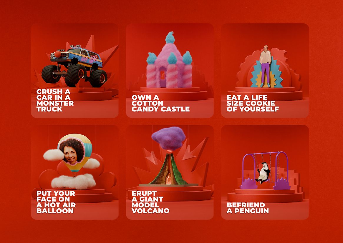 For Red Nose Day, the long-beloved campaign by Comic Relief U.S., we worked in collaboration with New York agency Gus to build “Childhood Dreamstakes”: a larger-than-life campaign that offered a silly chance to do some serious good. By donating to help end childhood poverty, entrants had the opportunity to crush a car in a monster truck, devour a life-size cookie of themselves, befriend a penguin, and much more! Inspired by vintage game shows, our campaign featured 3D representations of the prizes hanging from wires, revolving on turntables, and other tricks from the world of stage design and 80s sweepstakes. Feeling somehow both digital and crafted by hand, it was an absolute pleasure to craft these surreal wonders for a truly wonderful cause.