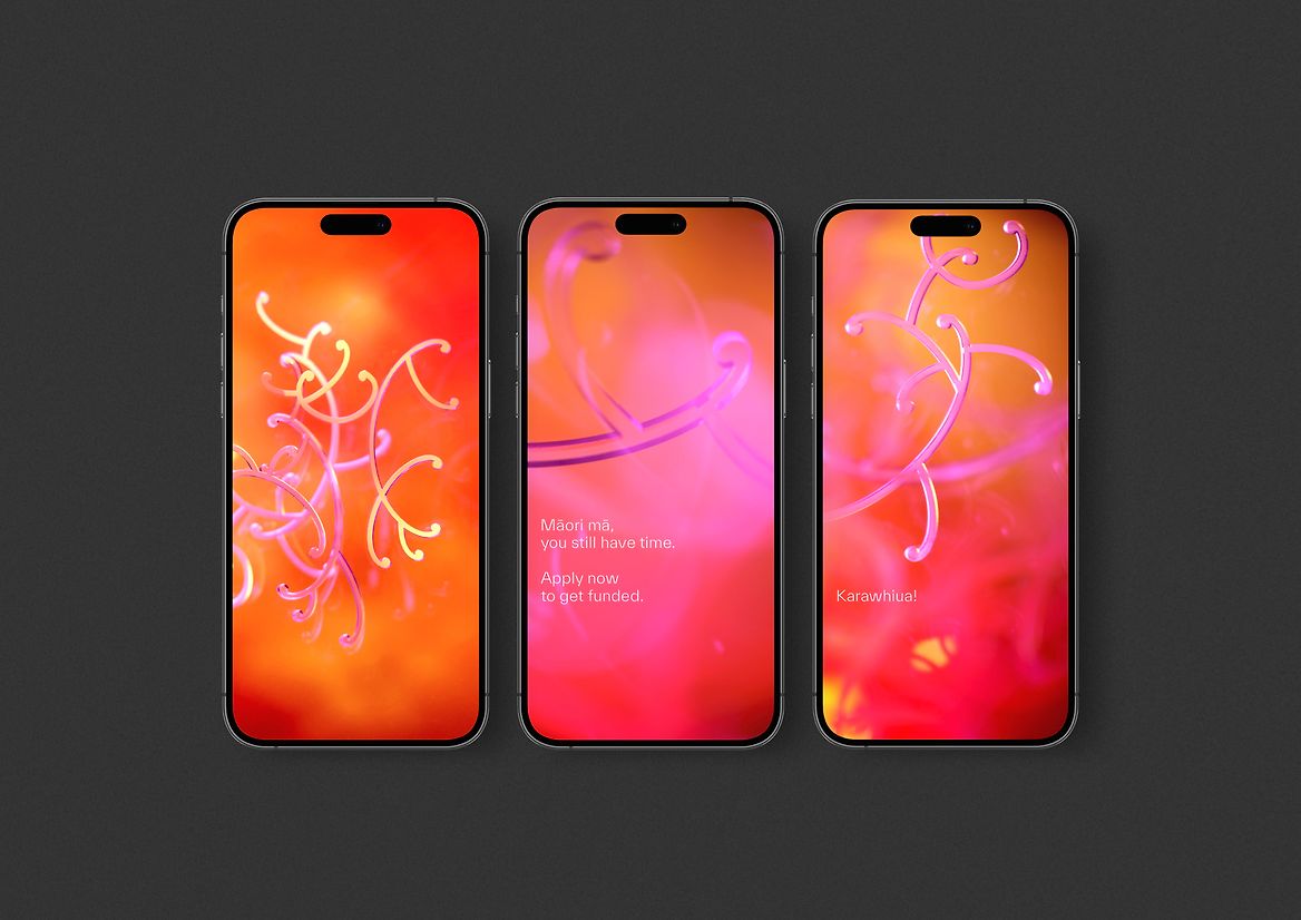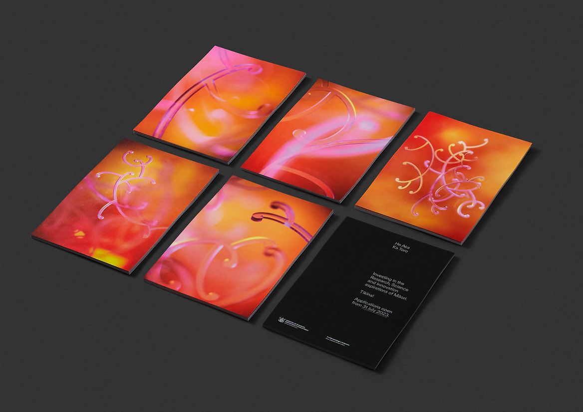 As a visual motif, the koru is undeniably (and proudly) Māori. It's symbolic of new life and ideas unfurling and taking form. To create our distinctive physical koru structures, we looked to traditional kōwhaiwhai patterning, but also took direct queues from the branching vines of our native plants. We then clustered these structures together to add further references, such as the creative process, the brain and our atomic makeup within the universe. Colour was another key aspect to the narrative. We chose a spectrum that spanned sunlight, through to the inner cells of a human body, symbolising our whakapapa (genealogical bonds) to our wider environment and the universe. The colours are turnt' up, vivid and vibrating with the vitality of innovation and life. A central hero photograph was created, as well a wide range of intimate, microscopic abstracts exploring aspects of the karakia. The overall result merges te ao Māori, the natural environment, human inspiration, and the world of science in an attempt to show the richness of mātauranga Māori. Because of the power of the photographs, we took a very simple approach to typography. These assets were rolled out across brochures, social media, digital and physical banners, stage backdrops and all necessary ministry comms.