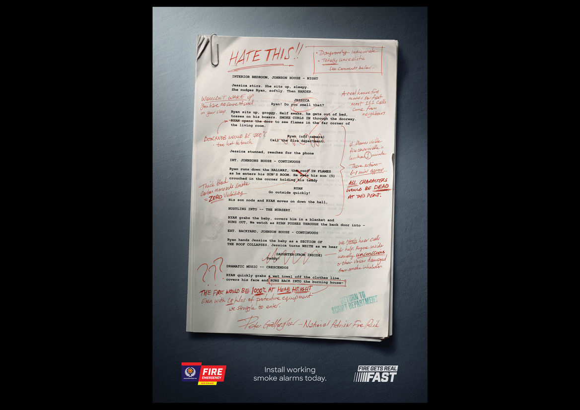 “Return to Script Department” was part of a nationwide campaign called “Firefighters Don’t Like Fire Movies” in response to a brief to draw to the speed of fire, and the need for smoke alarms to give you a warning. The campaign was created around the insight that people are complacent about the speed of house fires, because they’ve only seen Hollywood’s version of events. The dwell time of press was our opportunity to expand on all the chilling detail of the realities of fire, set against the most relevant backdrop for the campaign thought. A Hollywood movie script.