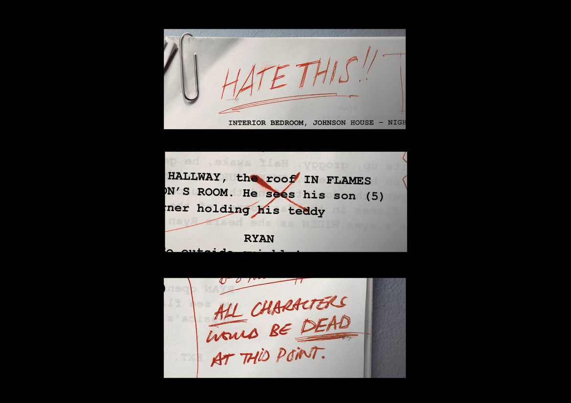 The script pages were shot in-camera, while the lettering was created by hand to represent the mounting frustration and build-up of emotion as the firefighter corrects the dangerously inaccurate movie script. The more orderly notation at the beginning, descends into dramatic underlines, emphatic retraces and expressive pen work. Hierarchy was achieved by leading with a prominent, bold statement and utilising linework to guide the eye along the printed type, leading all the way down to the signature of Fire and Emergency’s Peter Gallagher at the base of the page - a detail which adds an element of real-world authenticity to the piece. A variety of handwriting styles were considered, with the aim of balancing fluidity and expression with legibility. Overall the piece was created to draw the public’s attention to the distance between fiction and real-life danger, so balancing clarity of communication with the expression of human emotion was key.