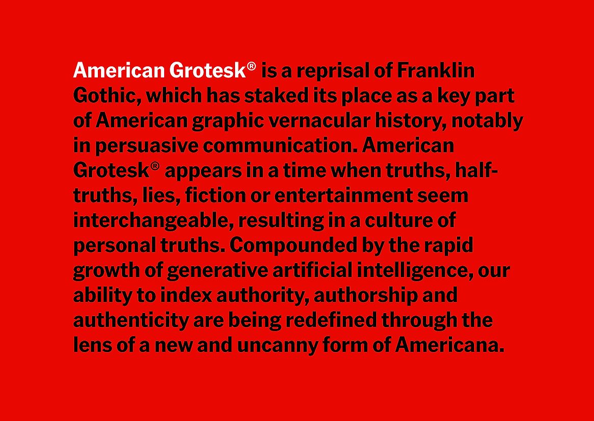 American Grotesk® is a reprisal of Franklin Gothic, which has staked its place as a key part of American graphic vernacular history, notably in persuasive communication. American Grotesk® appears in a time when truths, half-truths, lies, fiction or entertainment seem interchangeable, resulting in a culture of personal truths. Compounded by the rapid growth of generative artificial intelligence, our ability to index authority, authorship and authenticity are being redefined through the lens of a new and uncanny form of Americana.