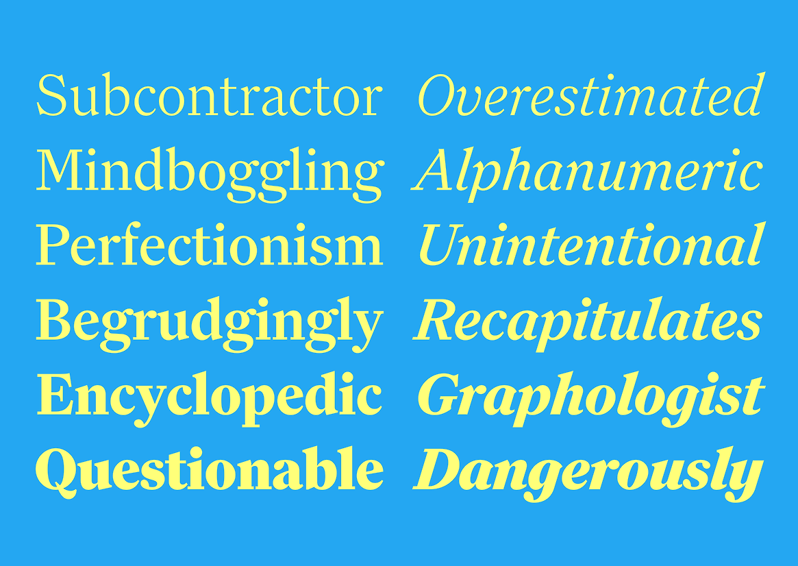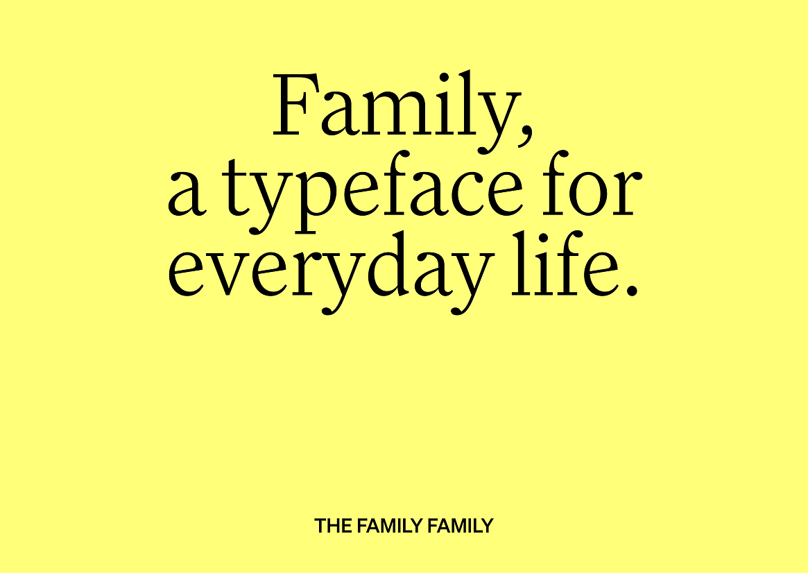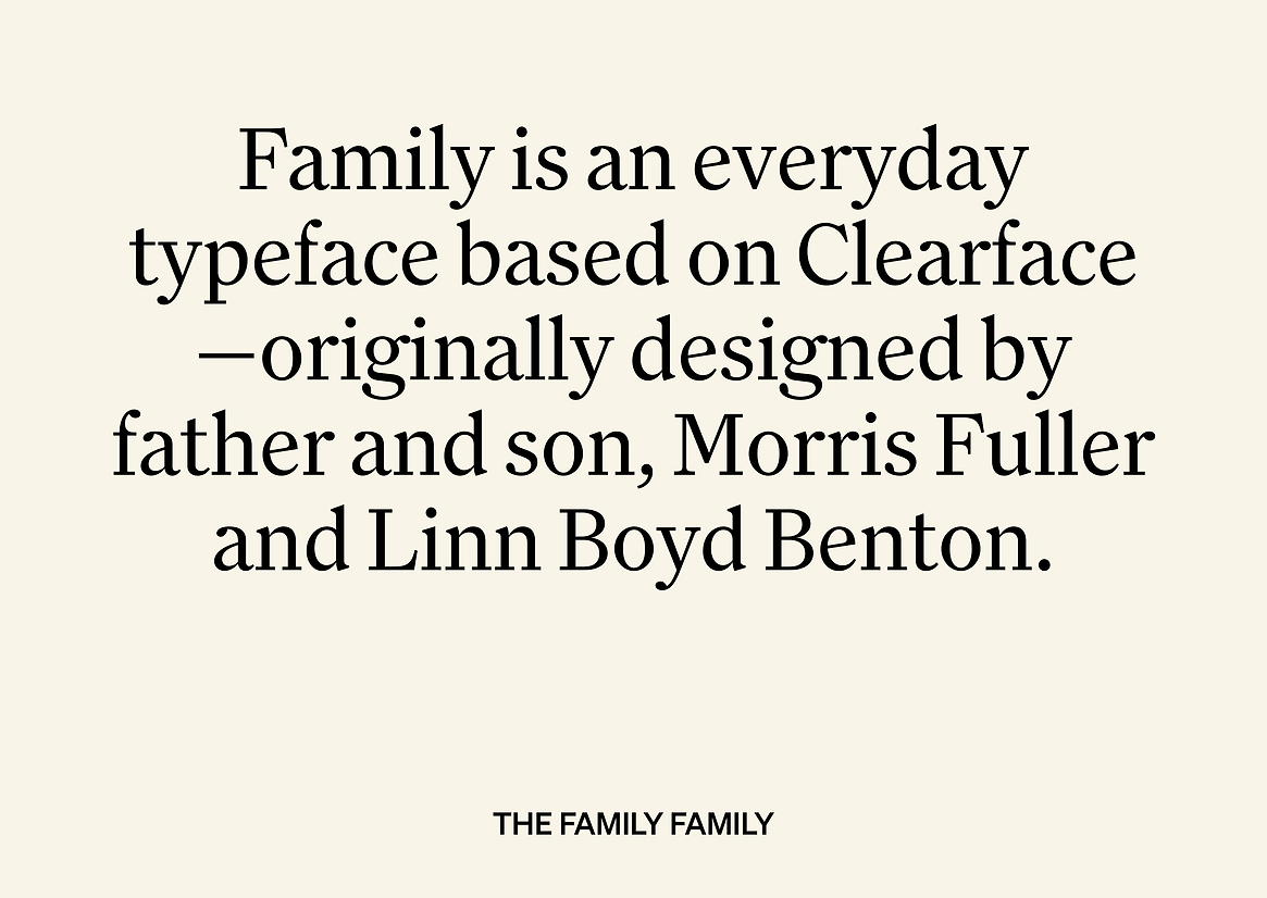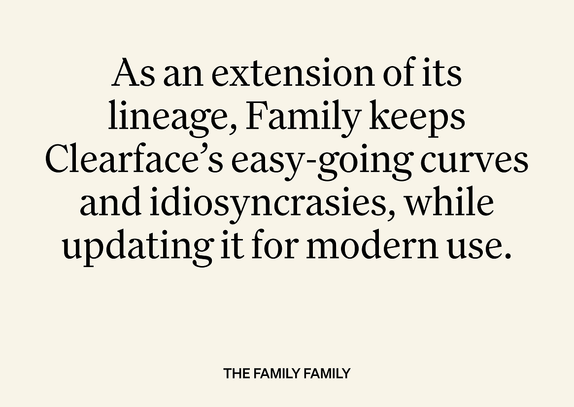Family is an everyday typeface based on Clearface—originally designed by father and son, Morris Fuller and Linn Boyd Benton. As an extension of its lineage, Family keeps Clearface’s easy-going curves and idiosyncrasies, while updating it for modern use.