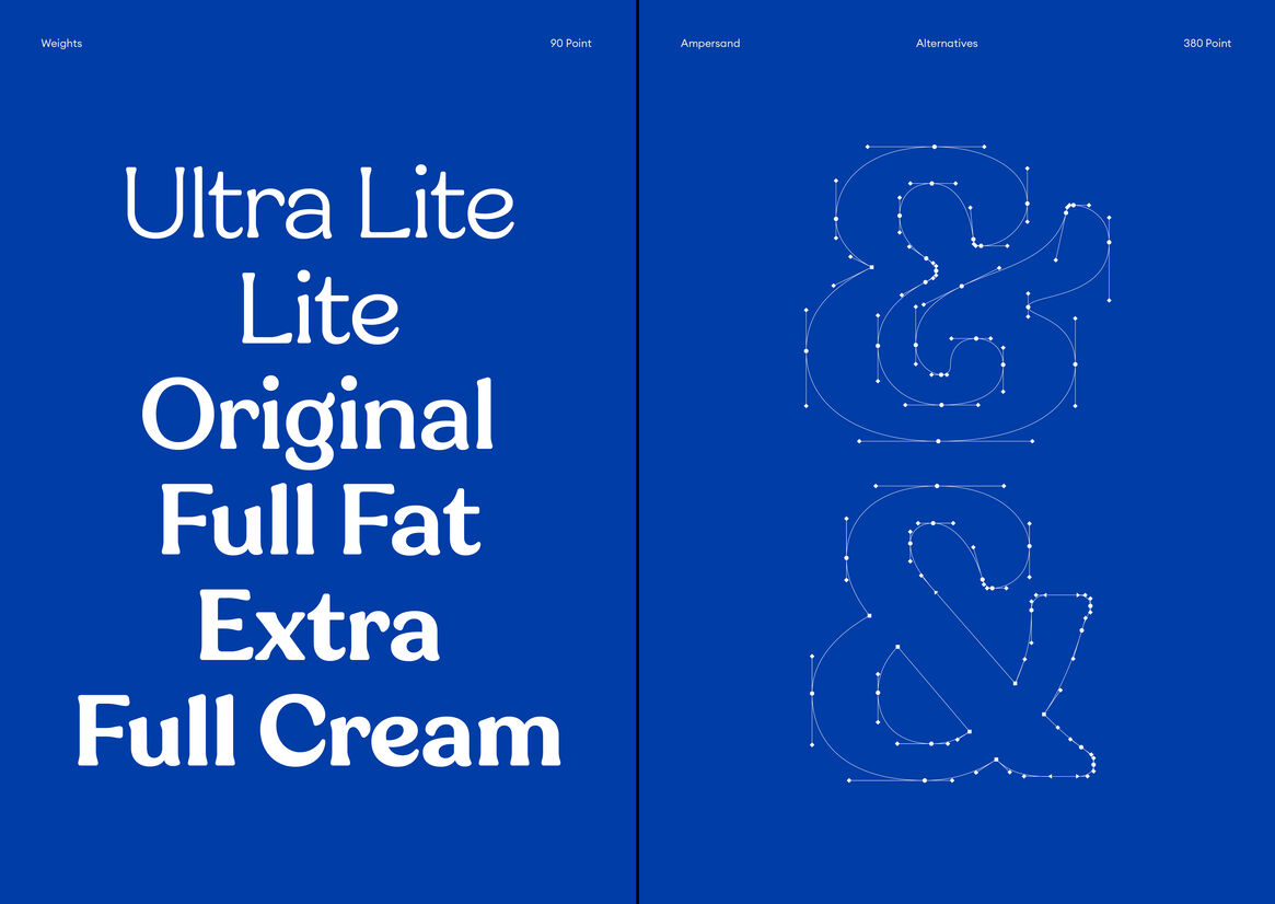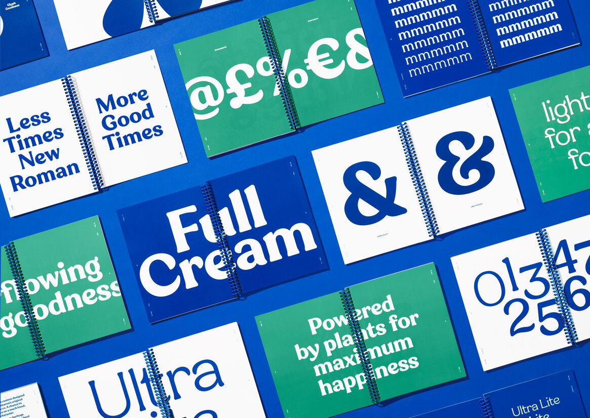 To be specific… plant-based forms feel milky as much as leafy, and the narrower serifs are less serious, more contemporary in tune with the brand shift. Variability is flexibility and weights can change via a sliding scale, a tilted counter form axis adds movement – making letterforms dance and at bolder weights, high stroke contrasts bring an ooey gooey, ‘full cream’ wholesome feel. We created seven delicious weights – from the most full cream, to full fat, through to ultra-lite.