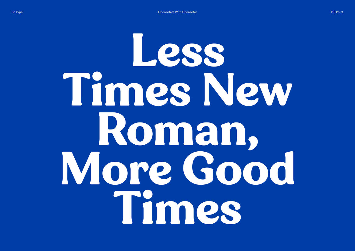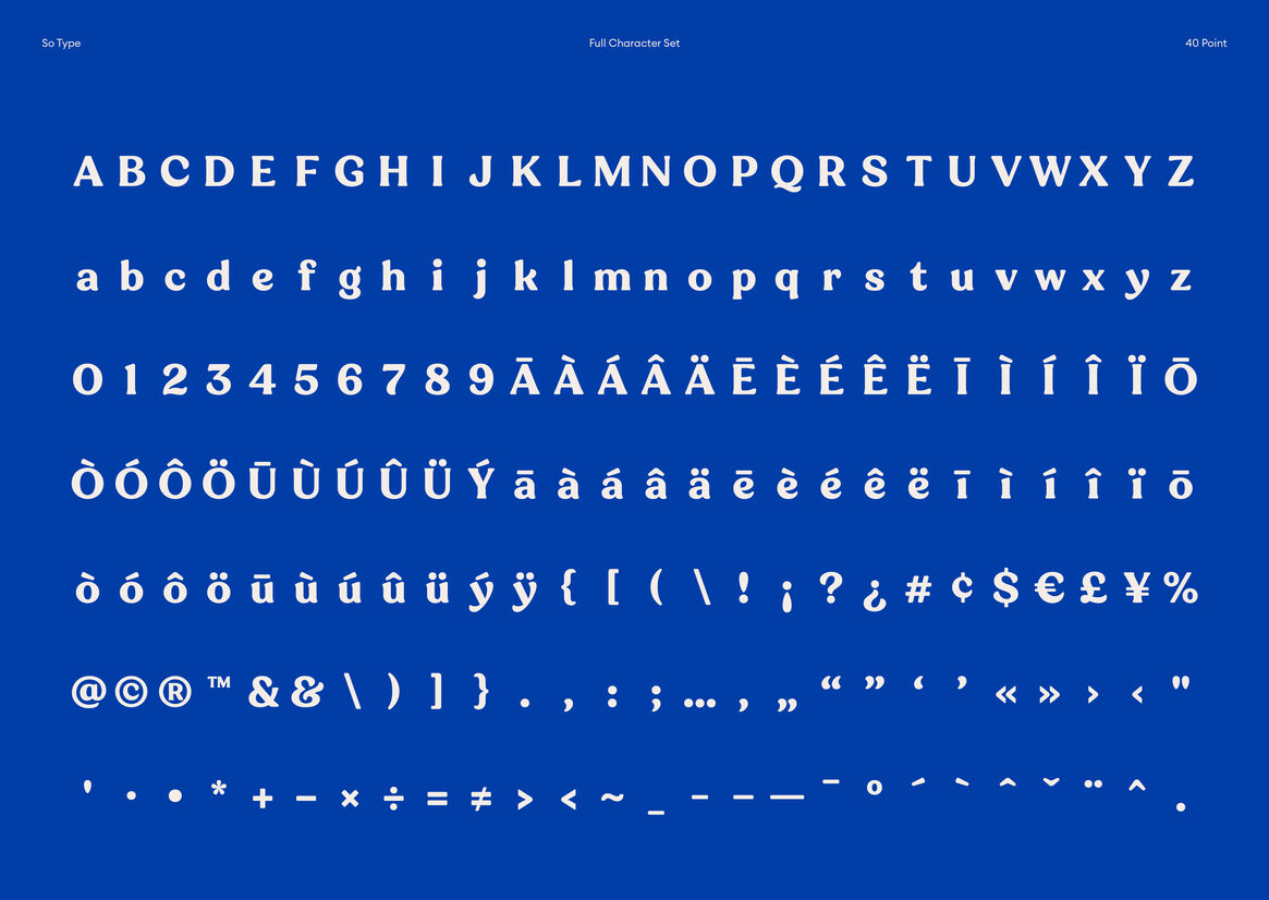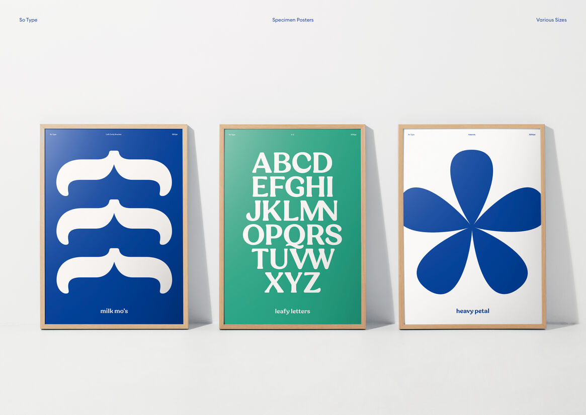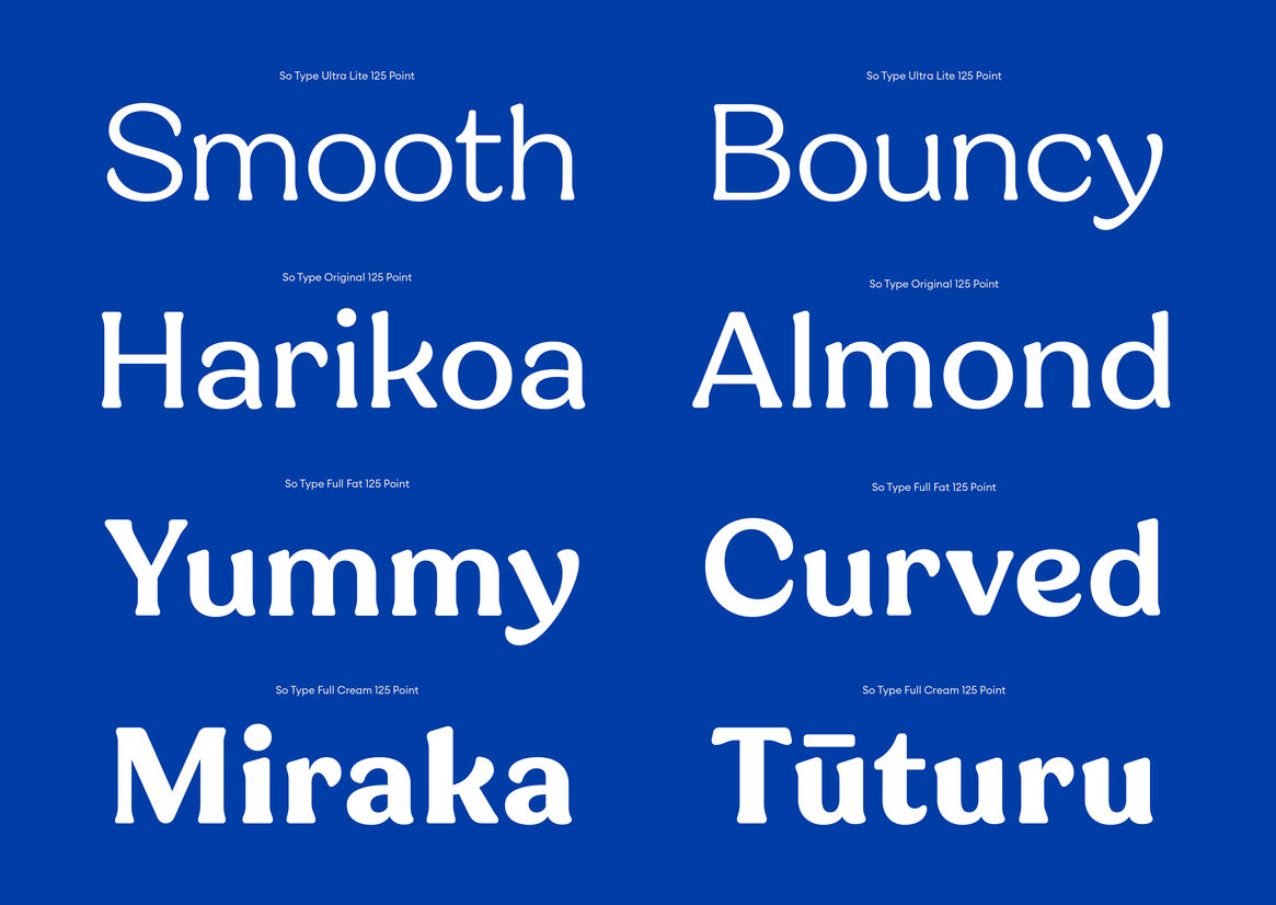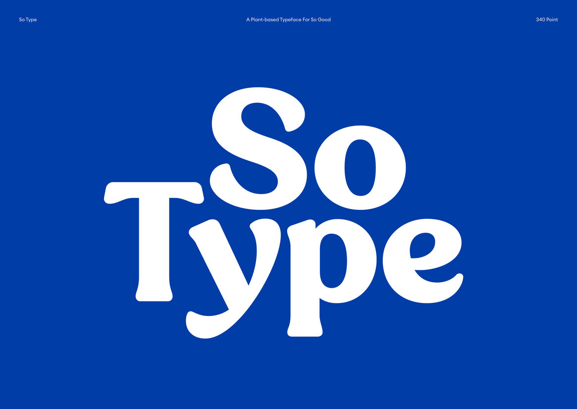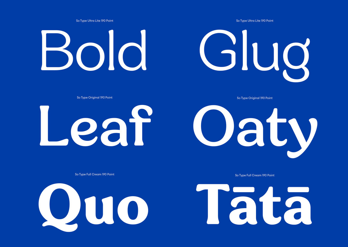 So Type was custom designed to be easy to get to know and fun to be around. A homage to heritage of softer serifs and old school characters from the 1970s that still taste good now. Playful quirks, wholesome forms, and loveable lines found in Cooper, ITC Souvenir, ITC Clearface and Windsor, are at the heart of ‘So Type’. To bring it into the moment, we added a fresh twist of nature - so typography could grow naturally and move playfully, with leaf like terminals, nature inspired ascenders and deliciously smooth serif’s, blended into one singular design.
