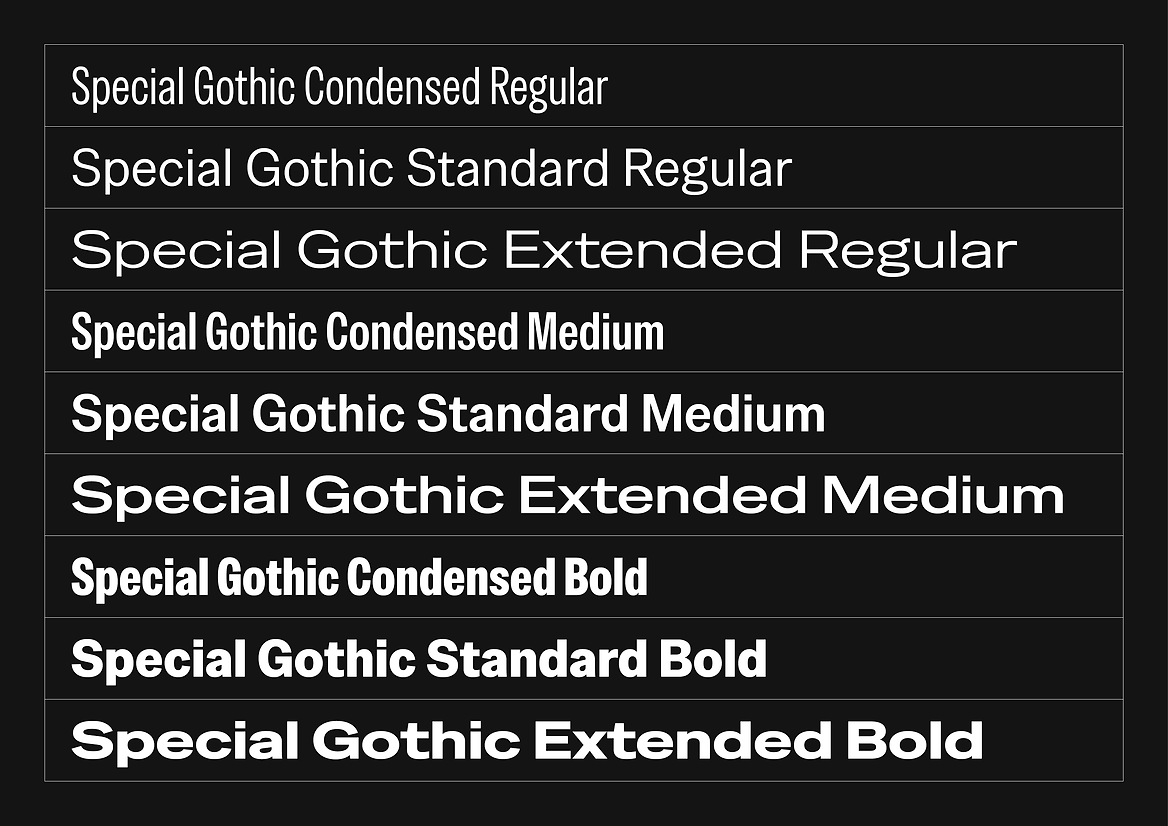 Special Gothic is inspired by the historical Trade Gothic which had been used by the agency for 15 years, and forms the basis for the enduring SPECIAL logotype. Designed in collaboration with Monolith, Special Gothic retains the practical and enduring qualities of the robust Trade Gothic while introducing a fresh, contemporary feel inspired by the likes of Record Gothic. Special Gothic is now a core part of Special’s global brand identity. It supports various applications, from digital to print, enhancing context and storytelling. It’s also a contemporary variable typeface, offering a range of weights including Condensed Regular, Condensed Medium, Condensed Bold, Regular, Medium, Bold, Extended Regular, Extended Medium, and Extended Bold — and everything in between.