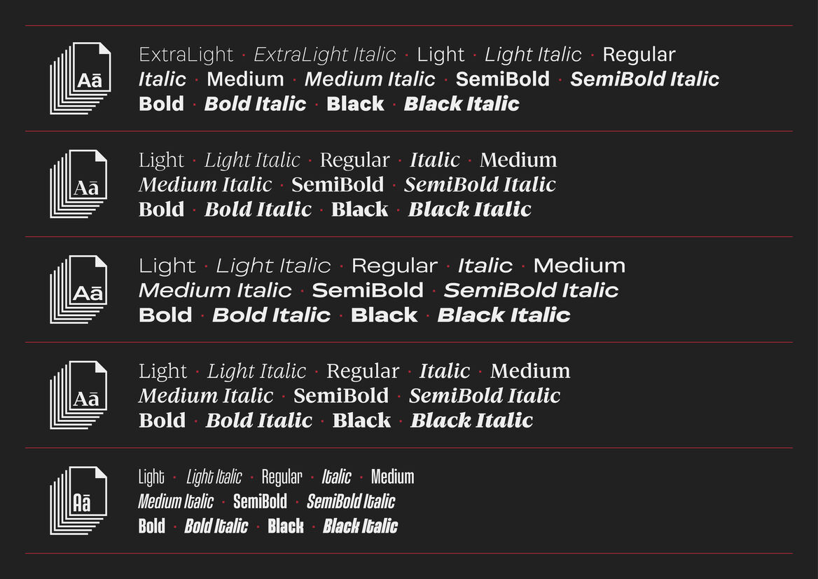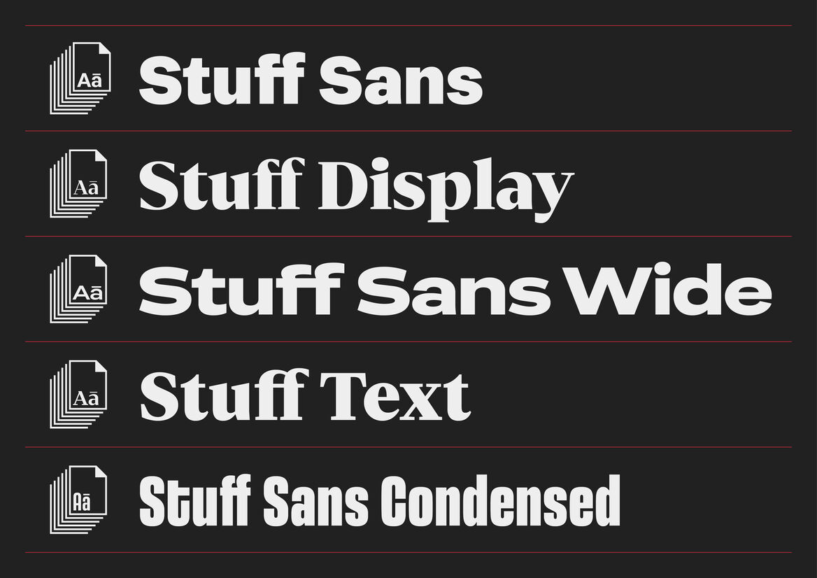 The Stuff Type Suite consists of 5 interrelated typeface sub-families, culminating in 62 individual fonts.