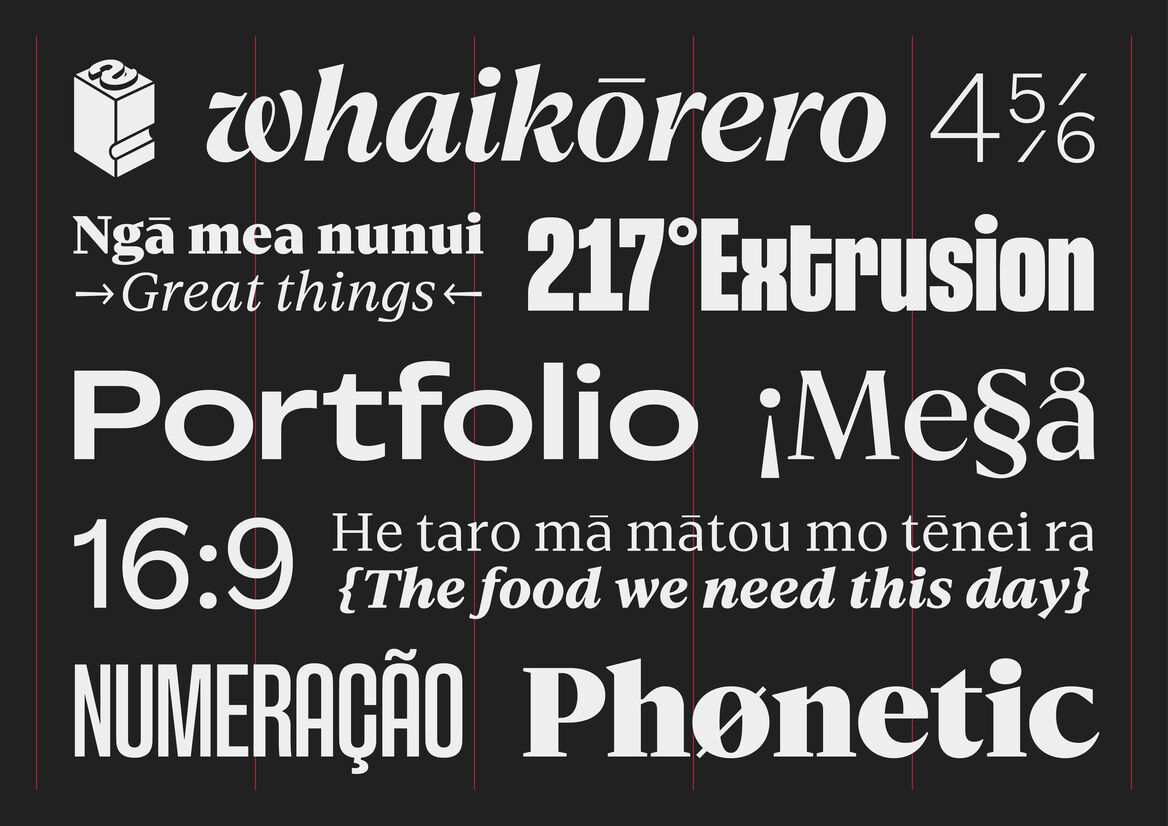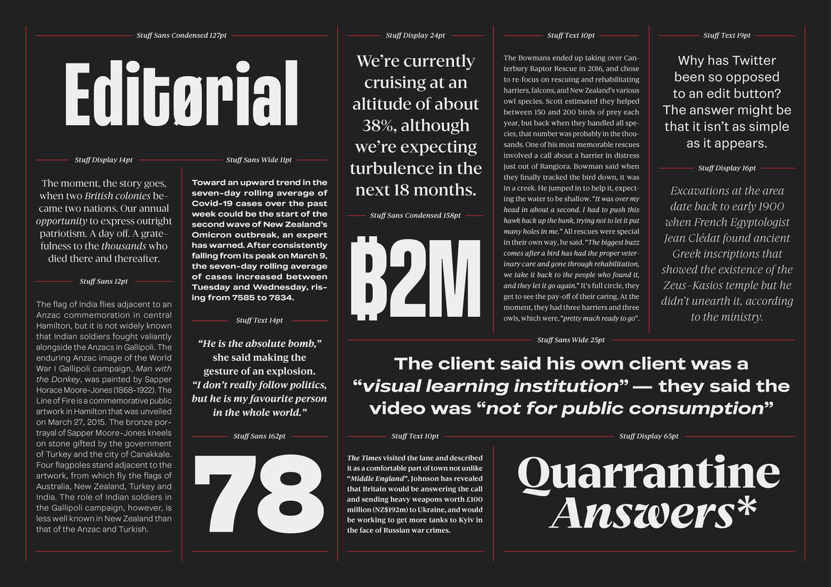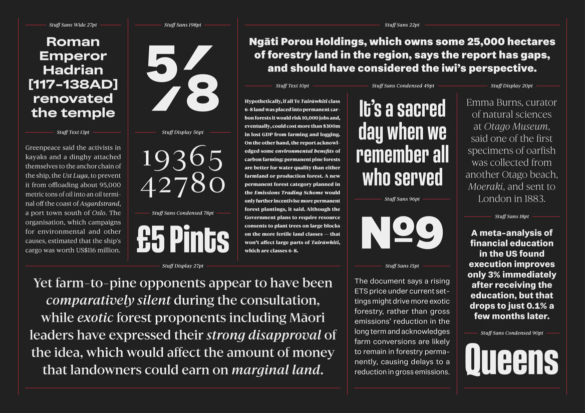 Stuff, a wide-reaching New Zealand media entity, began the process of re-establishing its own masterbrand around the archetype of the ‘restless creator’. The company’s existing typographic offering was both vast and varied, and did not cater to many specific typographic requirements critical to languages such as Te Reo Māori. After initial discussions around the potential for a large family of typefaces sharing a common design language, ideation began on a suite of types that each acknowledged the past through a forward-focused lens.
