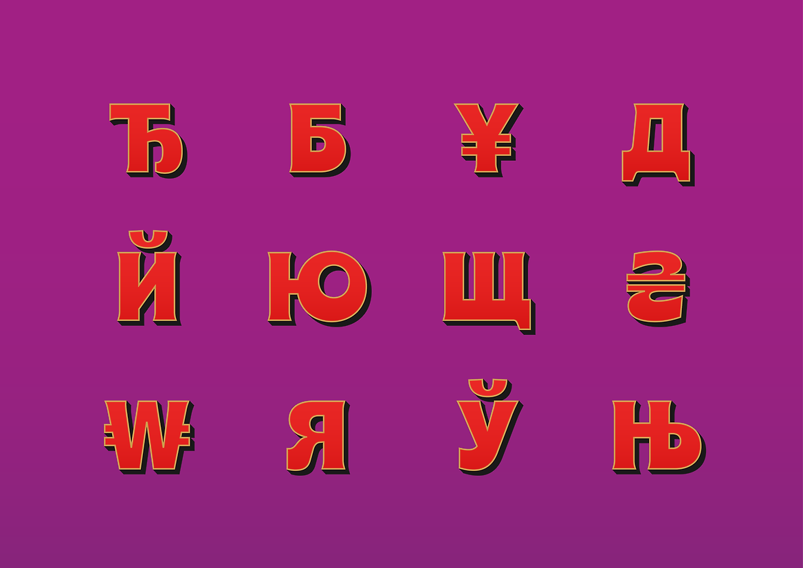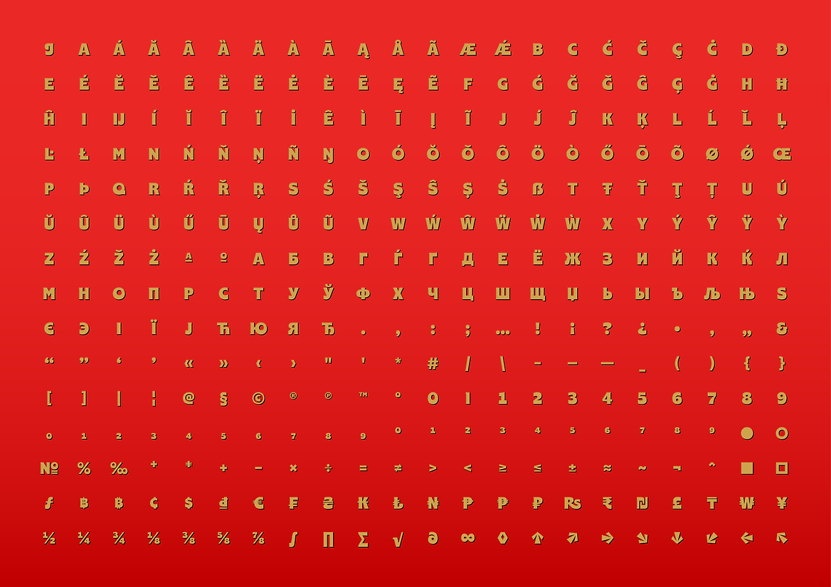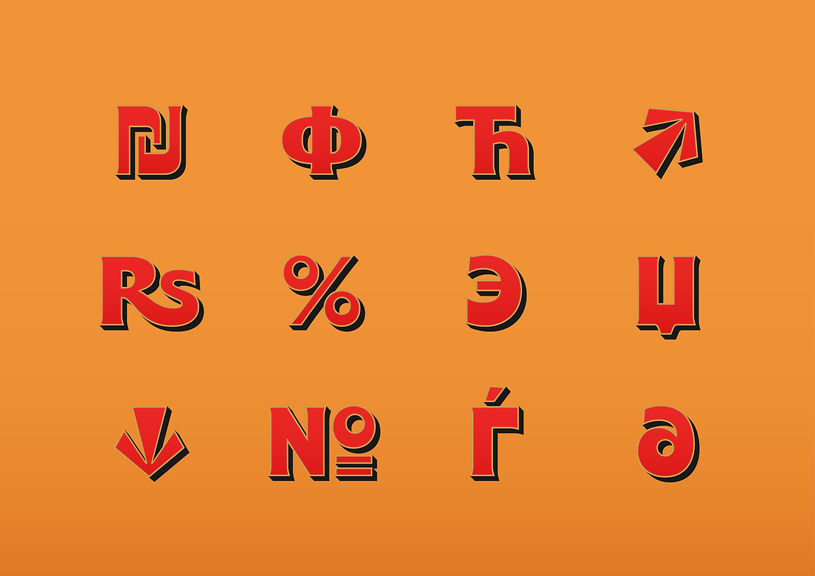 The Cyrillic extension introduced more advanced shapes into the typeface, requiring a higher degree of adaptability. The design tropes we associate with the Toblerone wordmark; a heavy baseline and corresponding drop shadow, required further bespoke treatment to ensure both legibility by brand and legibility by language. Each character is designed to exist within a larger type system, which was particularly challenging for intricate glyphs such as currency symbols. While many of these are informed by existing letterforms, the complexity that comes with the addition of vertical or horizontal strokes needed to be carefully managed to ensure visual balance alongside other characters.