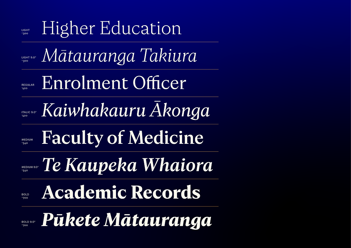 Wickliffe and Wickliffe Sans are two interrelated typefaces designed specifically for The University of Ōtākou, as part of a large scale restorative re-brand and re-naming process.