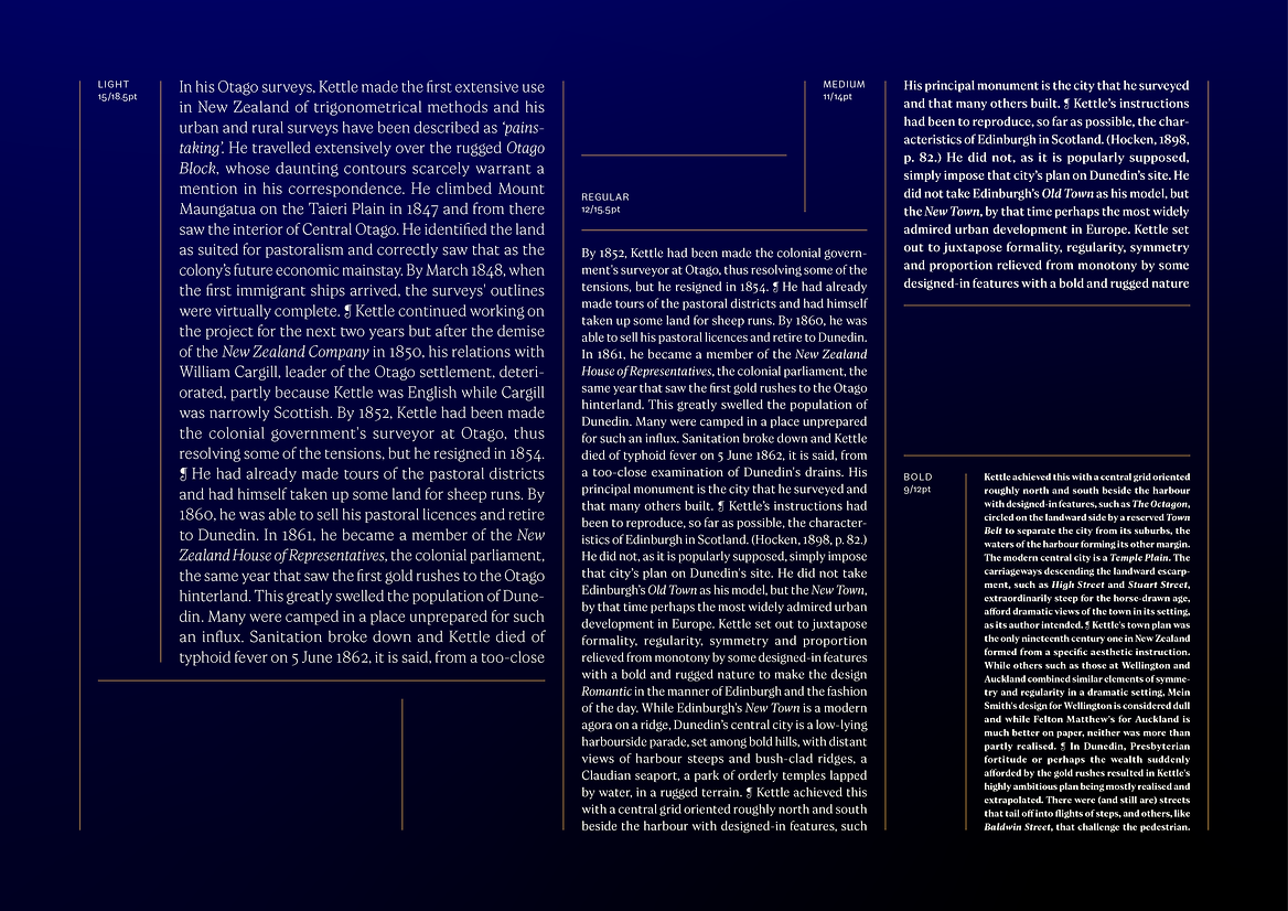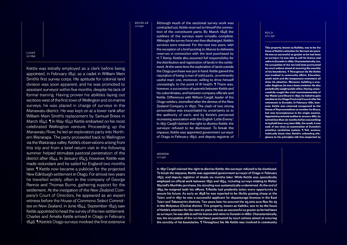 Wickliffe’s basic structure is influenced by the handwriting of the prominent surveyor Charles Henry Kettle, a key figure in the design and formation of the city of Dunedin. By evaluating the way Kettle’s pencil would strike the page, we were able to break apart the reinterpret the rhythm of the serif format, treating each stroke as an equal part of the letterform system. Due to the handwritten origin of these characters, the lowercase and corresponding numerals are therefore drawn from the same pen-first approach, resulting in a unique and modern take on what are otherwise very ubiquitous shapes.