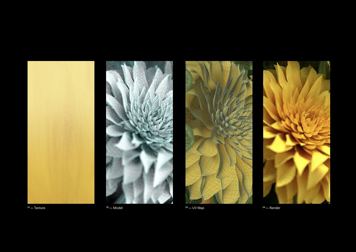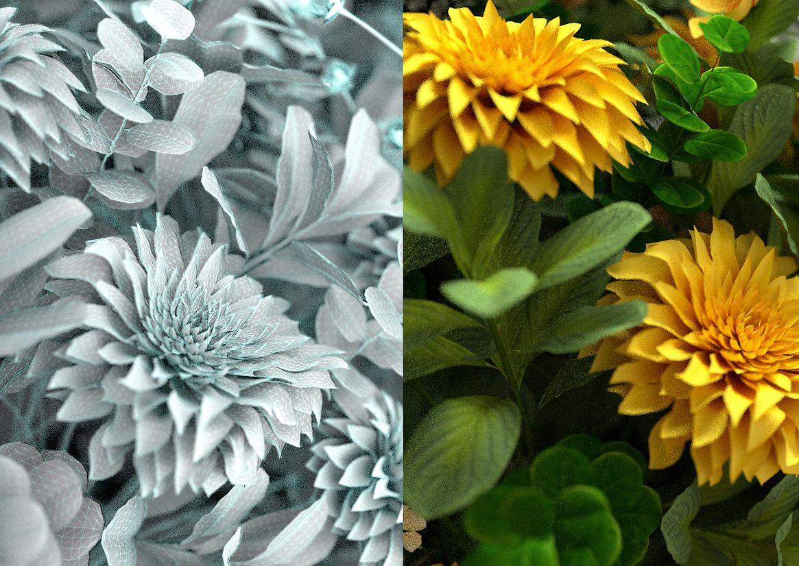 We then created 42 botanical species from scratch, with over 600 models per scene, followed by a workflow of texturing and lighting.