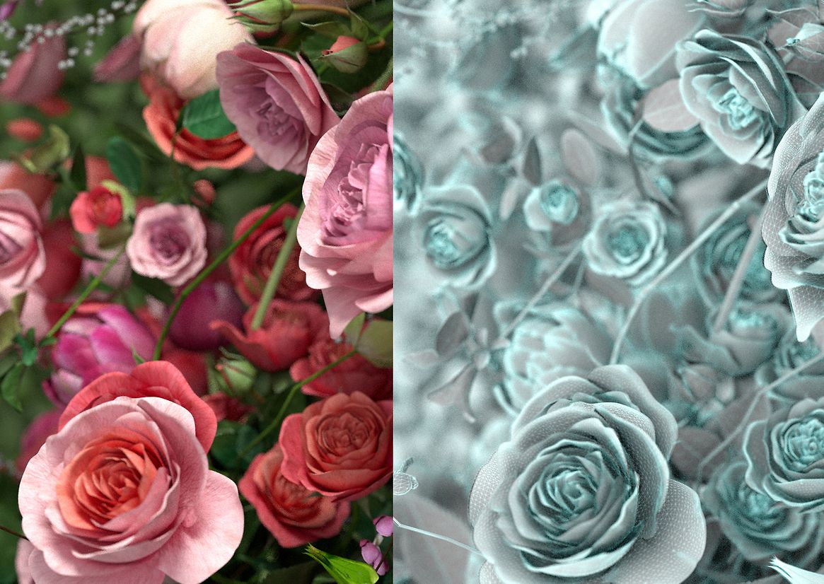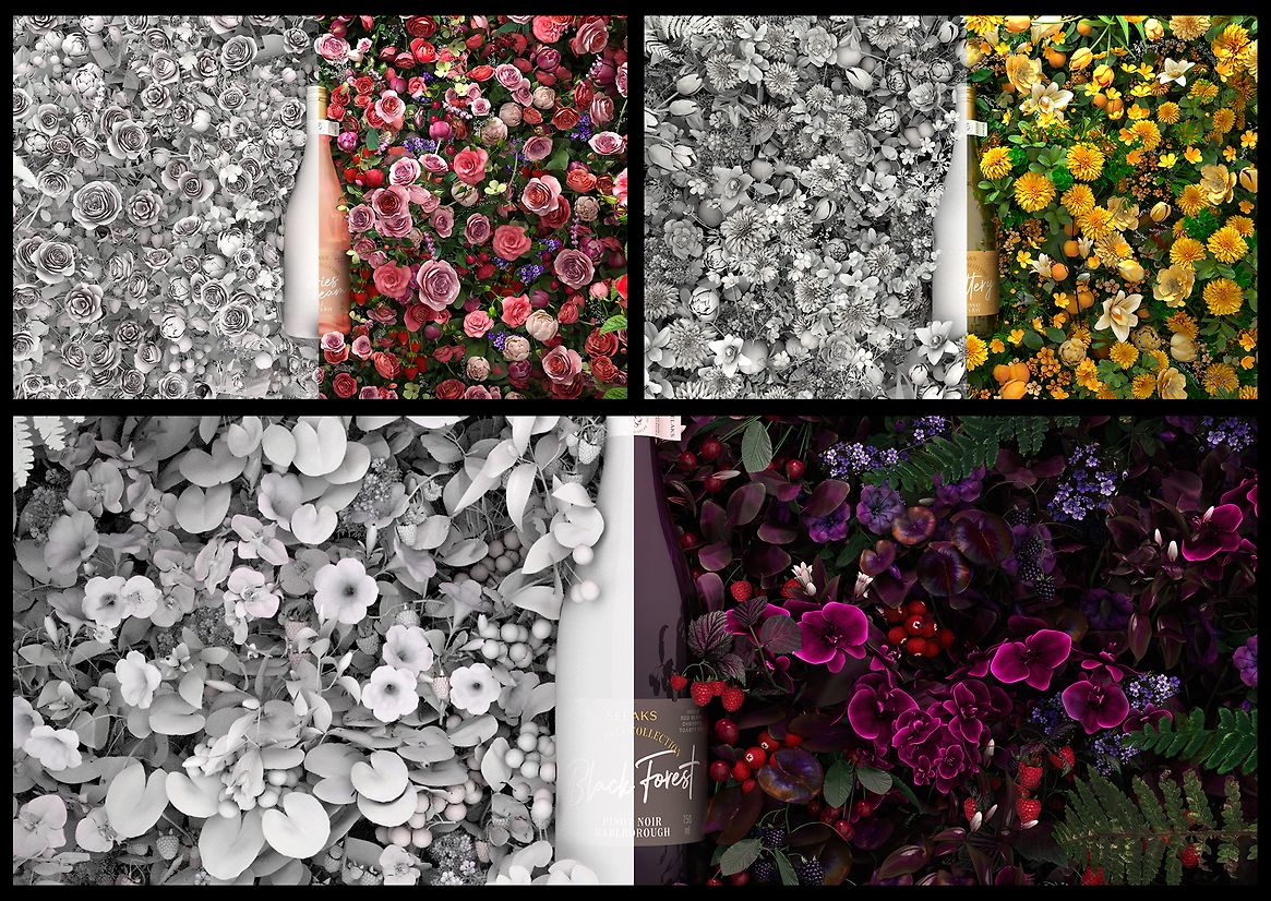 Because of the timing of the project, most of the fruit and florals were out of season, and they don’t grow together naturally anyway. This meant photography was out, so we turned to photo-real 3D.