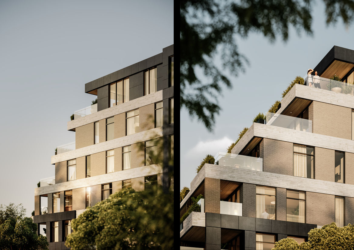 Our approach to the choice of angles was inspired by architectural photography: square-on composition; a mix of lenses and orientation (landscape and portrait); the use of depth and focus; and a desire to capture the essence of the built form. We explored key design features – the stepping of the western façade and the large level 1 private courtyards – with close-up studies using zoom lenses and heavy depth-of-field. These images, while not part of our formal engagement, add a richness and realism to the set.