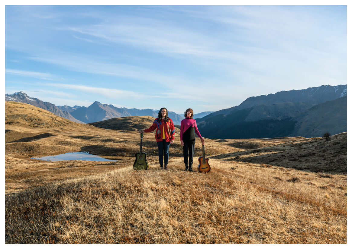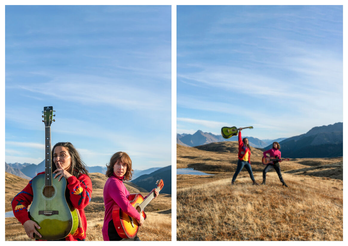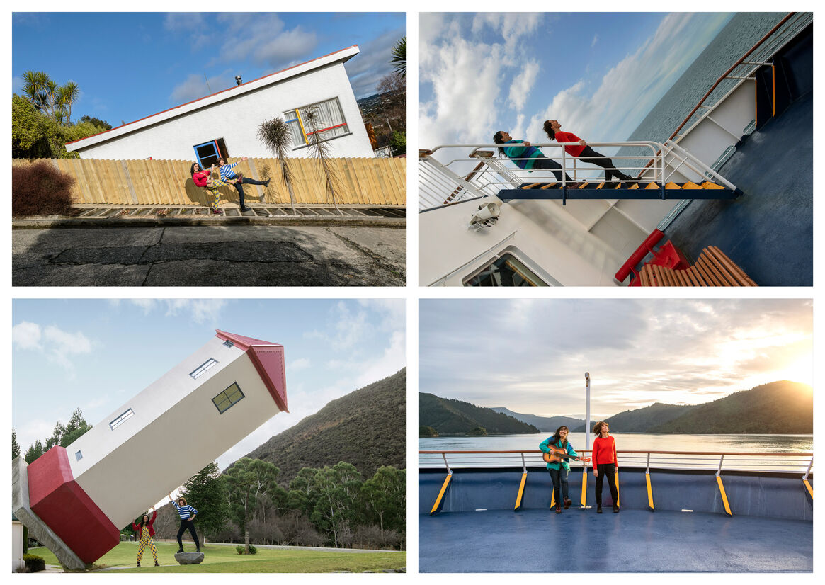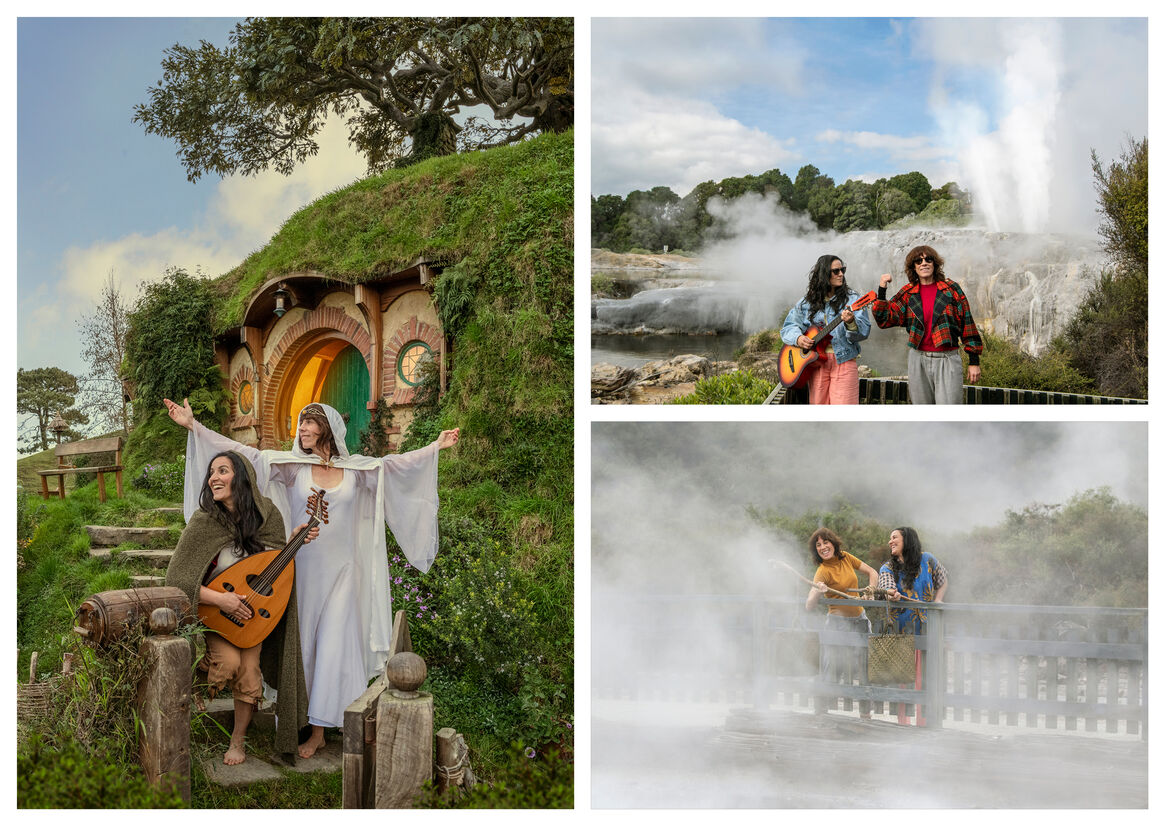 Echoing scenes from the video, the photographs are epic in scale and feature Madeleine and Jackie doing new things around New Zealand. From seal-spotting on the rugged Kaikōura coast to lute-playing in Hobbiton, these images all capture the cheeky, down-to-earth Kiwi humour of our song and its stars.
