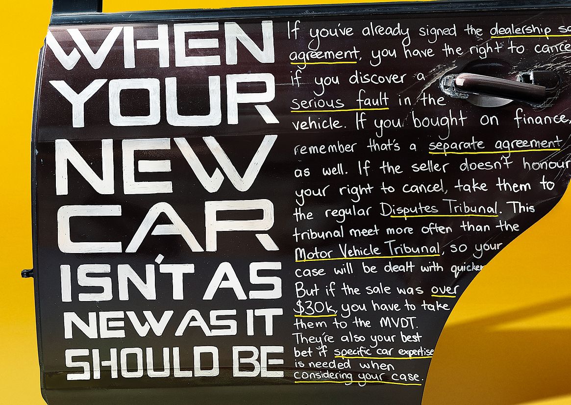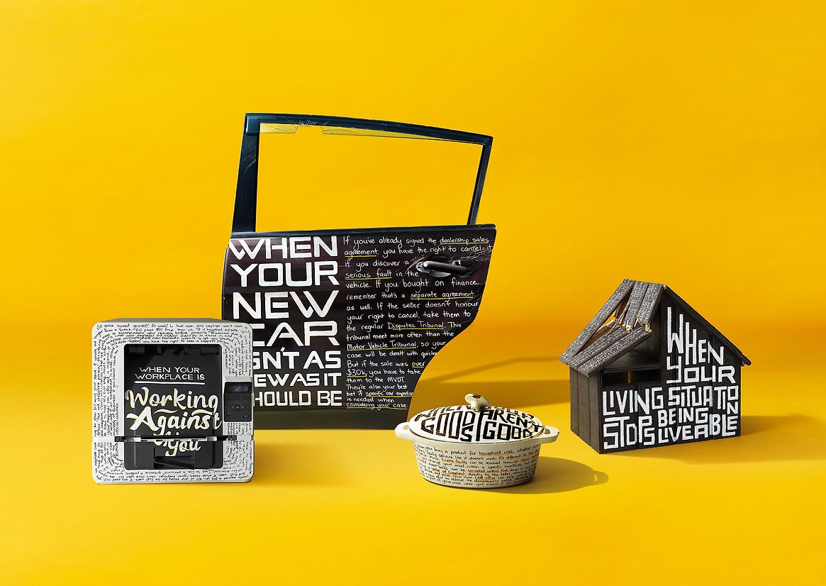 To get the message across, we used everyday broken objects and decorated them with hand-painted typography that shared our advice. We then auctioned them on Trade Me, with the price representing the estimated value of the free advice we give away, every month. This creative approach made the medium part of the message itself.