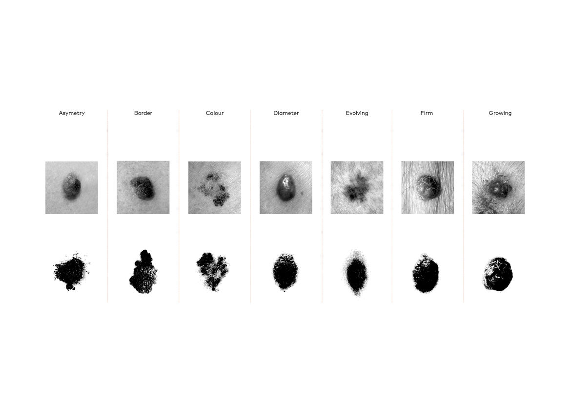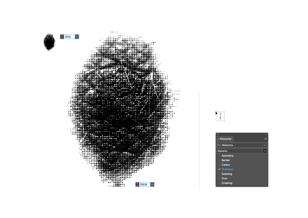 We created a usable font, made up of seven glyphs of a single character - the full stop. Each glyph was designed in partnership with New Zealand medical professionals to accurately represent one of the visual symptoms of Melanoma. When viewed at a small size, the glyphs all look like slightly misshapen full stops. But as point size increased, more and more detail is revealed in each character, until the true nature of each spot is impossible to ignore.