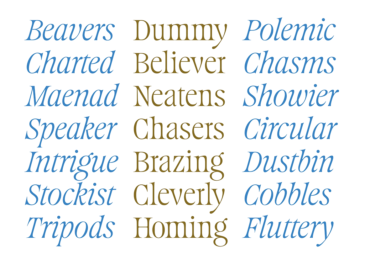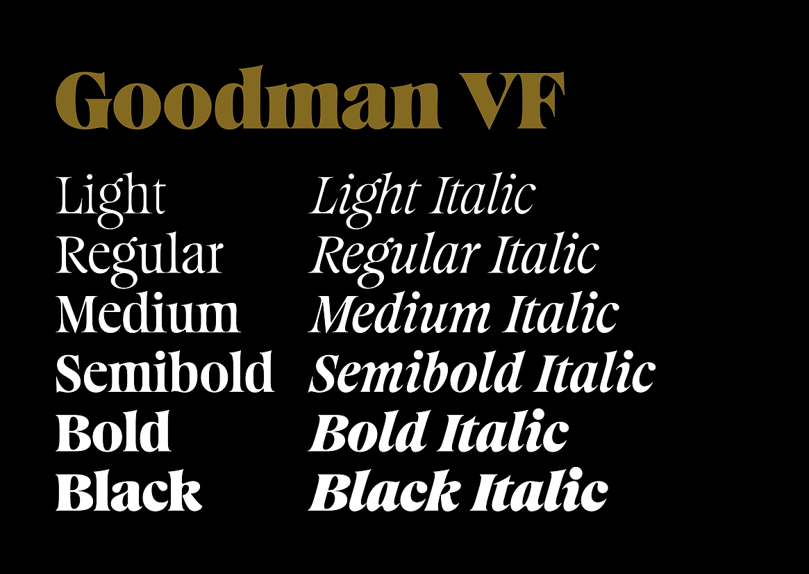Goodman is driven by a deep commitment to preserving the essence of the original design and selectively infusing it with contemporary versatility for modern typesetting. The design of Goodman Italics has been further refined to accentuate their graceful nature.