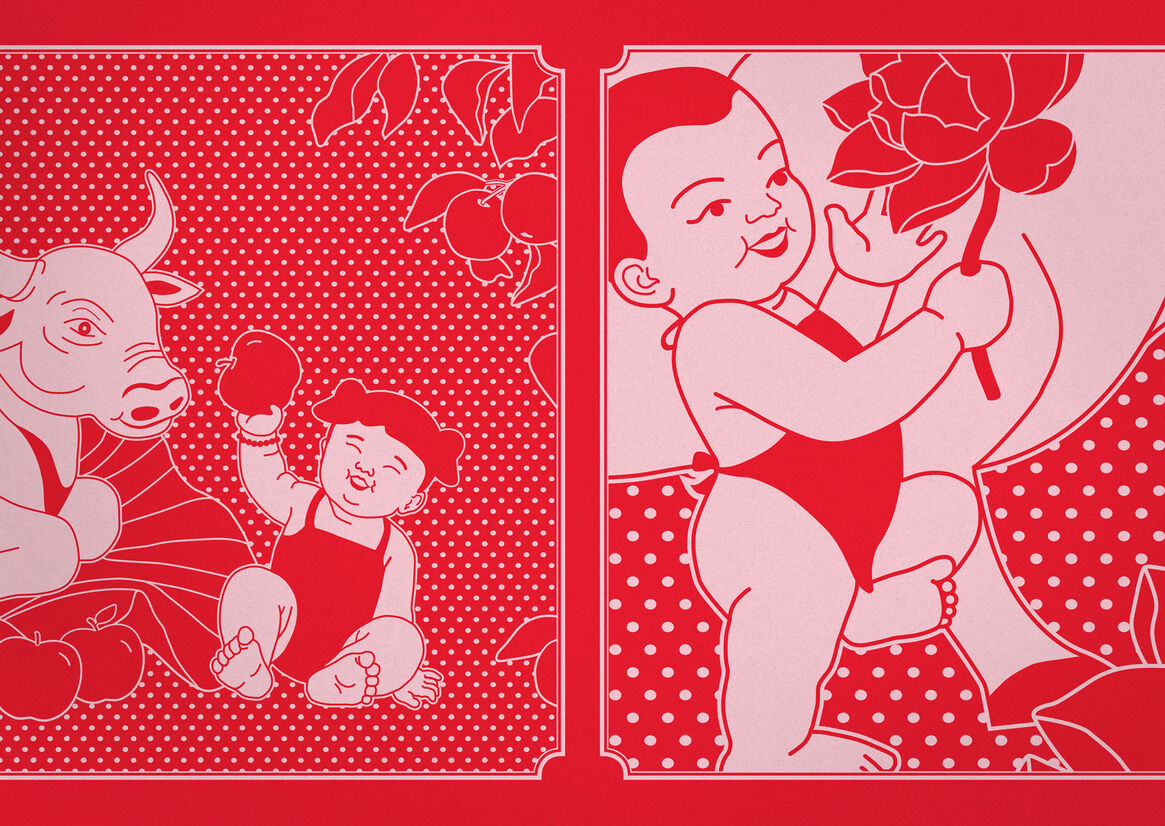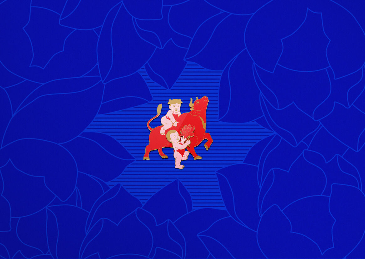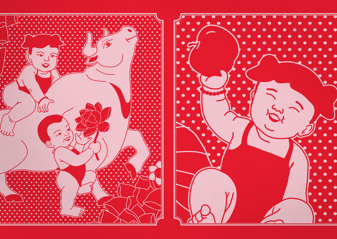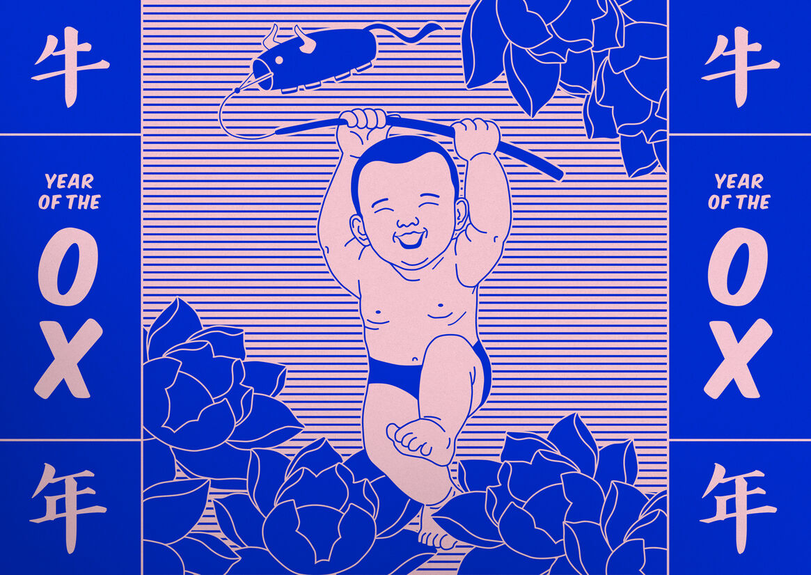 Chinese New Year traditions are filled with meaning. These illustrations are also embedded with significance. The Chinese Zodiac is built on the principles of yin and yang. So for colours, we chose to pair the bold use of a fiery red, which helps drive away evil spirits, with a cooling blue. The Ox is a symbol of determination and honesty and the smiling infant represents happiness. By depicting the Ox and the infant together, a relationship between these two concepts is created. As the Ox and infants march together, they represent new beginnings and a celebration of the year ahead. Clasped in one baby’s hand is a lotus flower. It’s a popular Chinese icon used to signify purity and a fresh start for the coming year. Another motif is a toddler raising an Ox kite to represent freedom and good luck. As the kite resembles an Ox, it also signifies a year when hard work is rewarded with prosperity. In another scene, the Ox and an infant share an apple; this act of sharing represents peace.