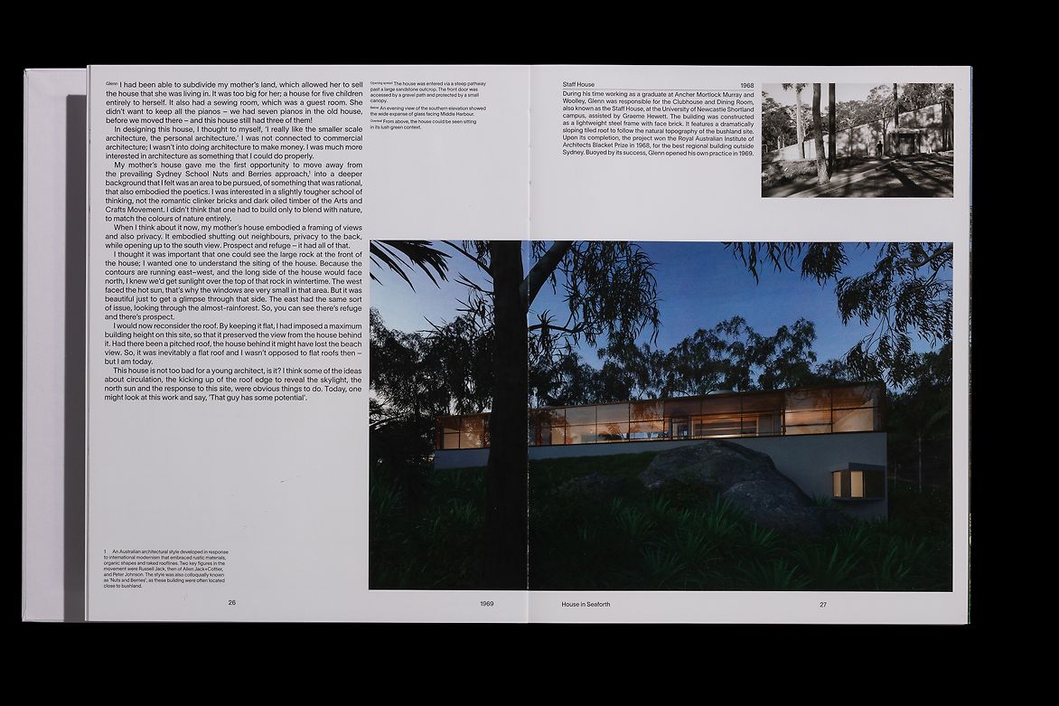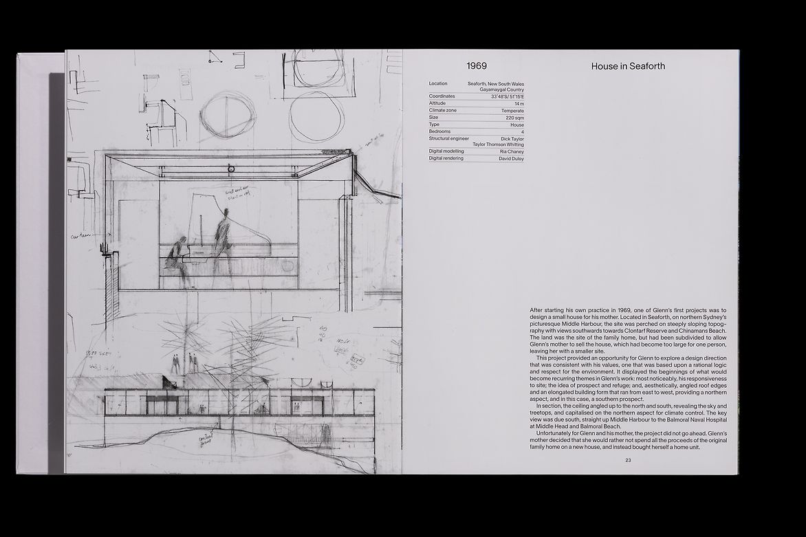 The design idea is to create a package that is experimental yet authoritative, richly illustrated with working materials but with clarity in reading experience. Glenn's philosophy is all about the relationship of his built environments and the landscape that it stands so materiality needs to reflect that, and the topic of the unbuilt.