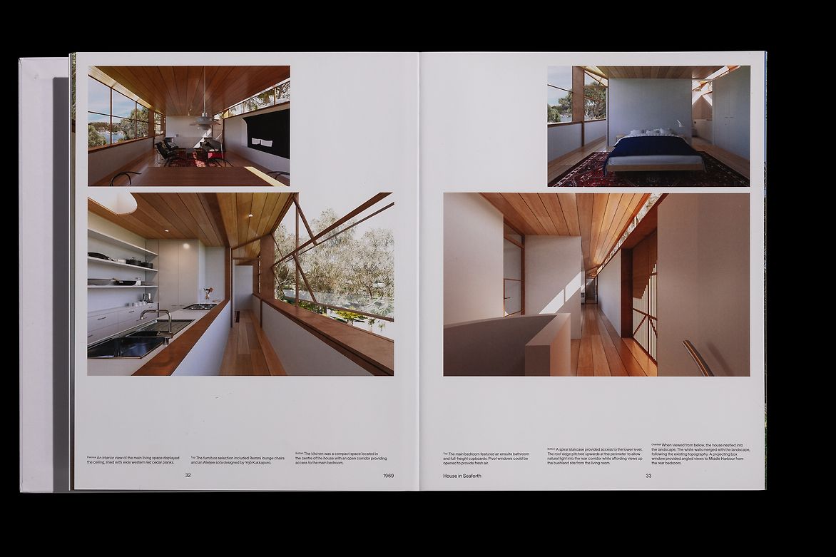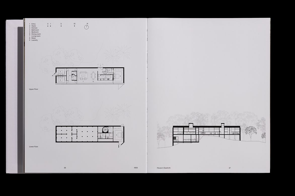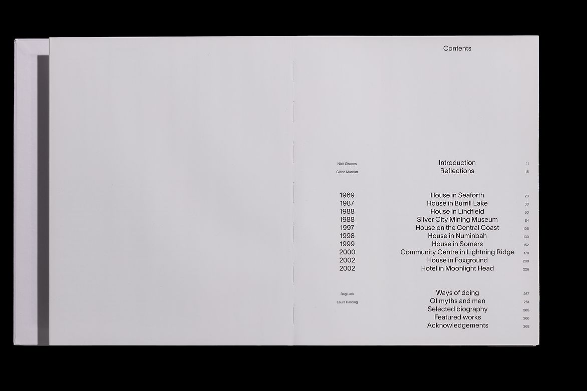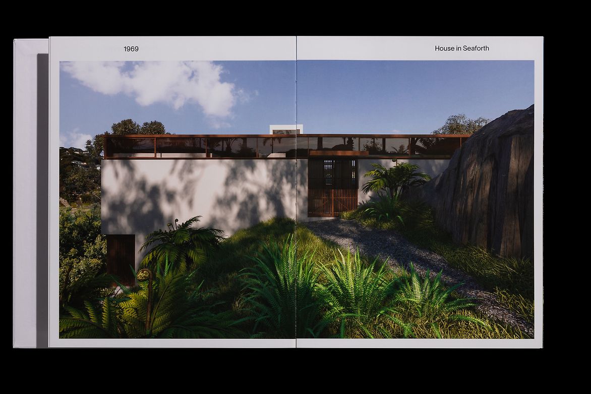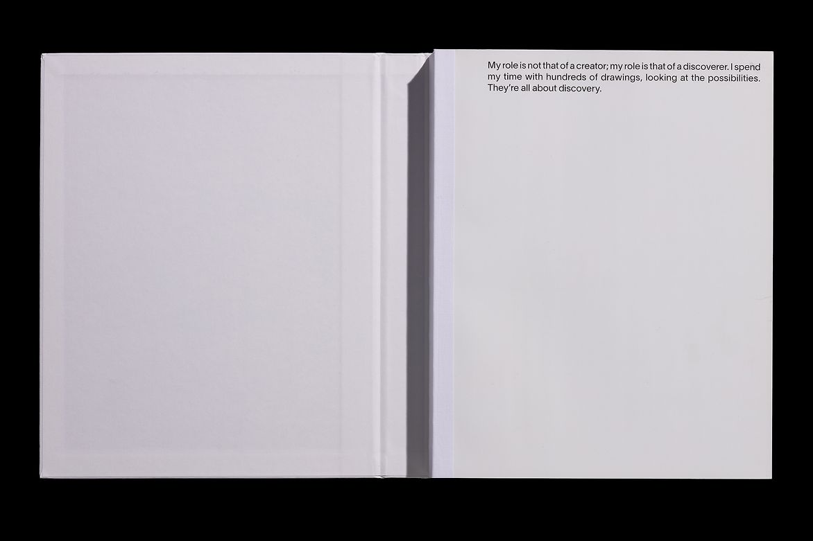 The design features a grid that confidently structure text, sketches and photographs to create an engaging storytelling. Functional typography works with a grid system that allows organic rags, a nod to Glenn's design philosophy: To respond to the natural. Visualising 'Unbuilt', blind deboss of a sketch is utilised on the cover, emphasising that something is yet to materialise, reacting when hit with light. Materials include coated stock for a futuristic feel mixed with uncoated exterior to ground the whole package. A Swiss-binding is utilised to ensure the book lays flat and doesn't interrupt architectural drawings and renders. The package is all white, a nod to purity: of untainted process and result.