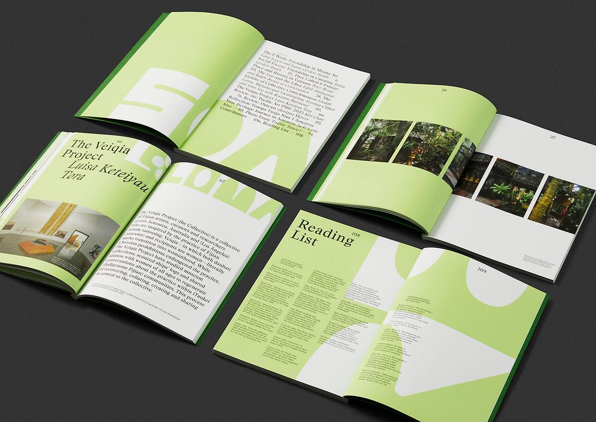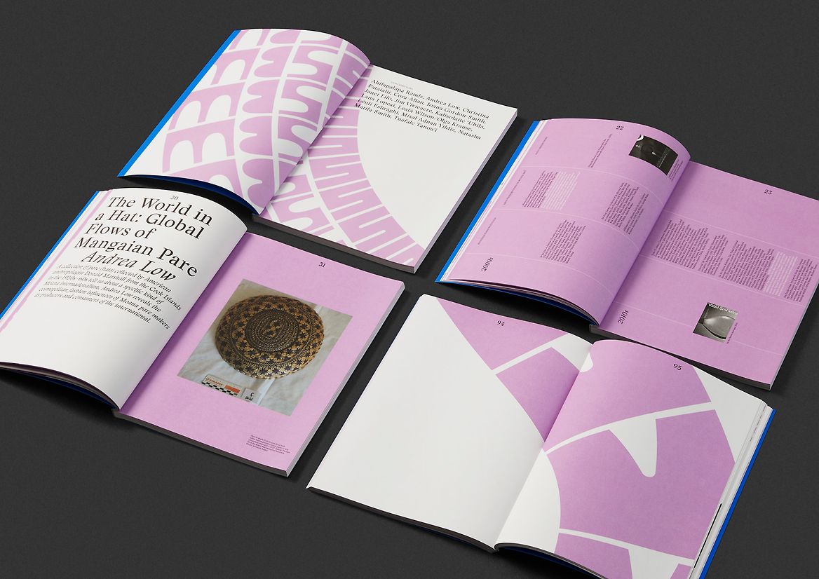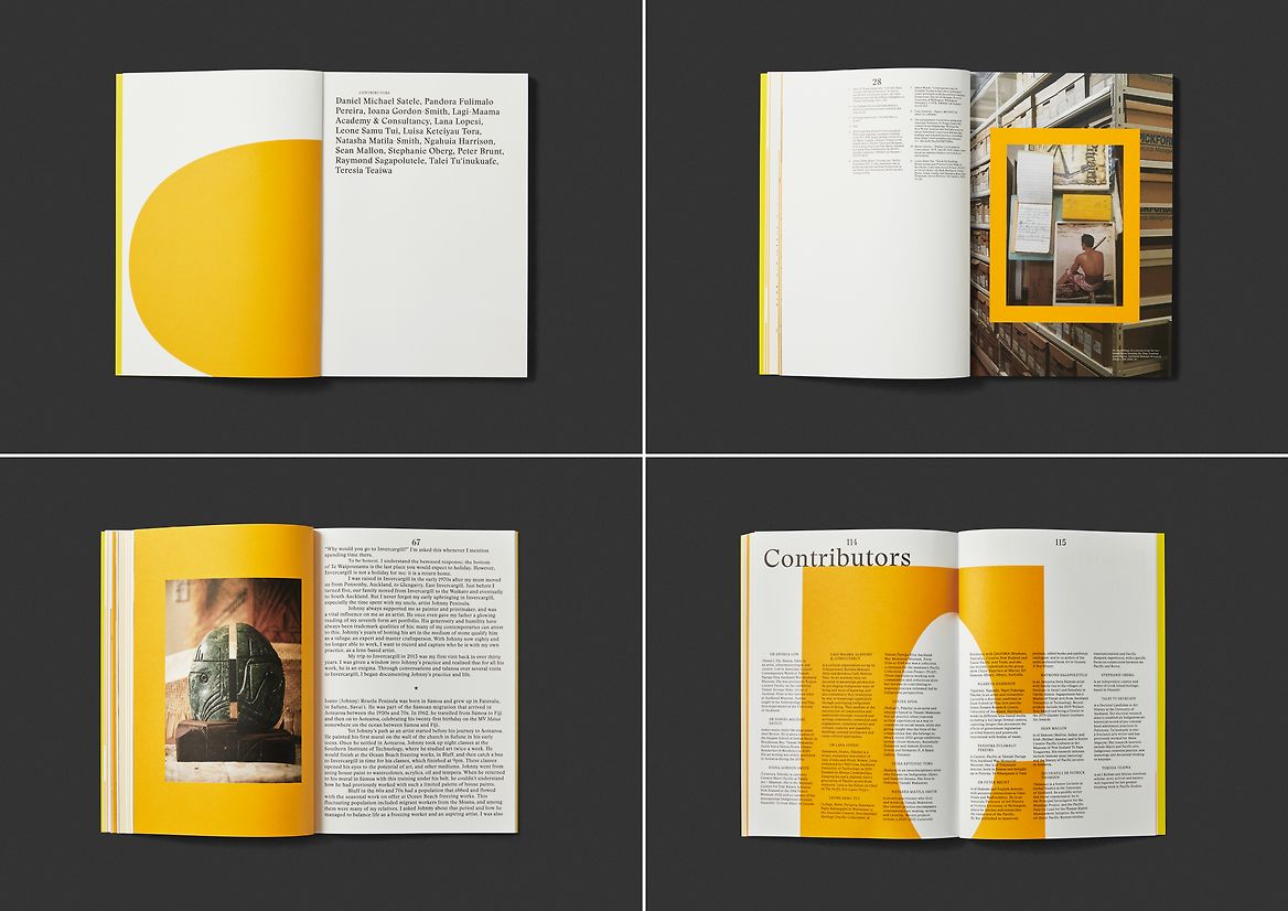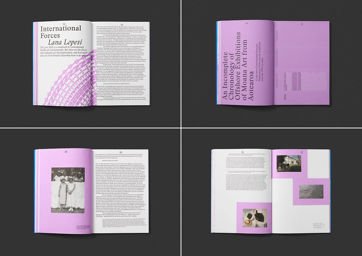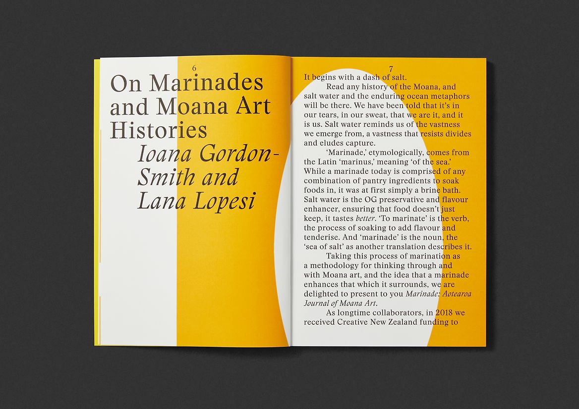 Through kōrero with the editors, a clear design personality for the journal was developed. One that shunned the weight and responsibility of being 'the official journal' for Moana Arts in Aotearoa, and instead had a sense of freedom. Marinade is intellectually curious, wacky, chunky and daring. It adds weight to imagination and creativity. It's bigger than the frame, and is free to be what it wants to be.