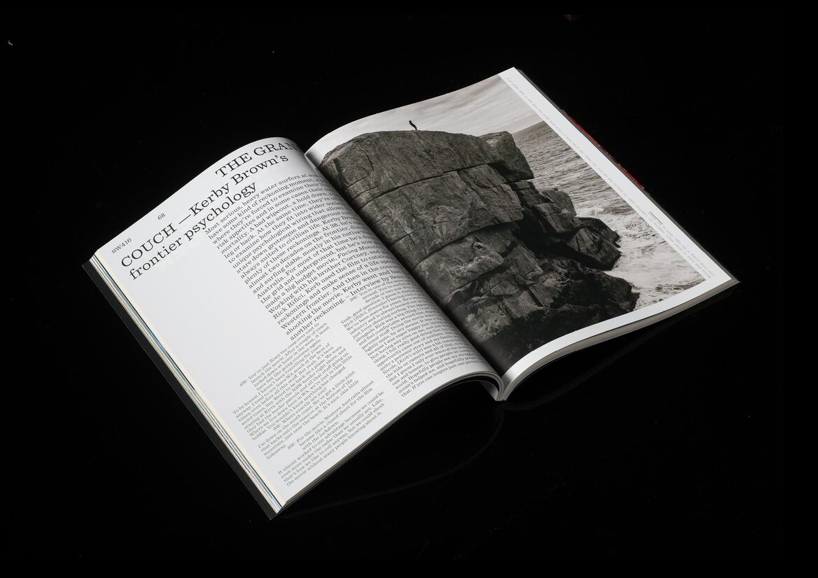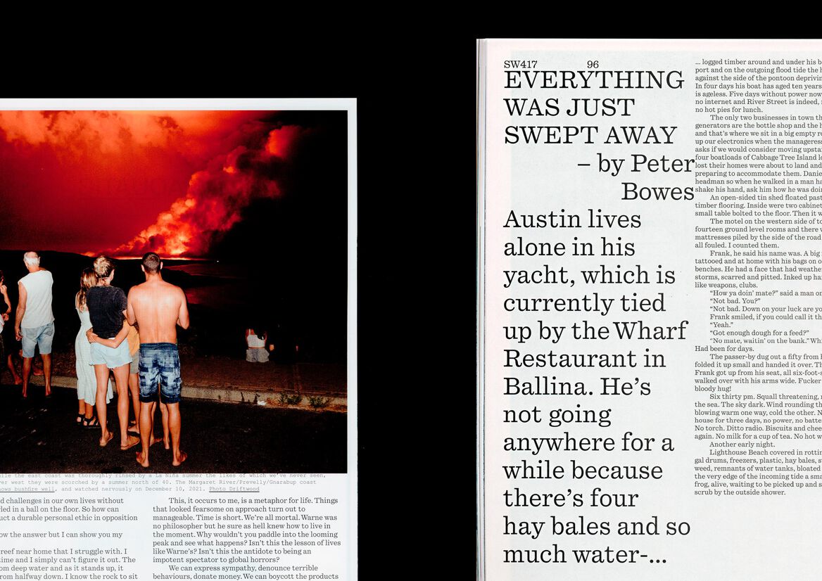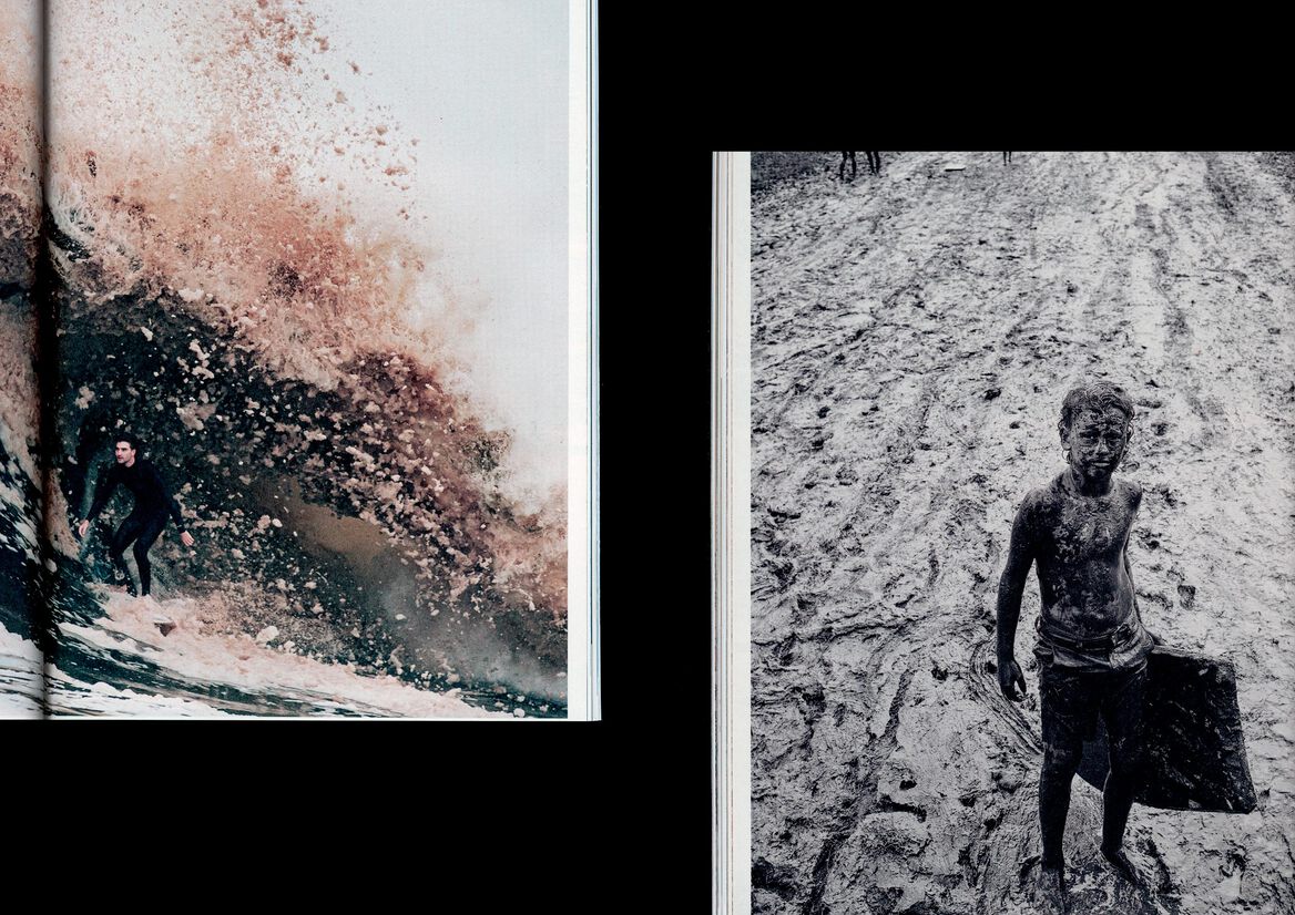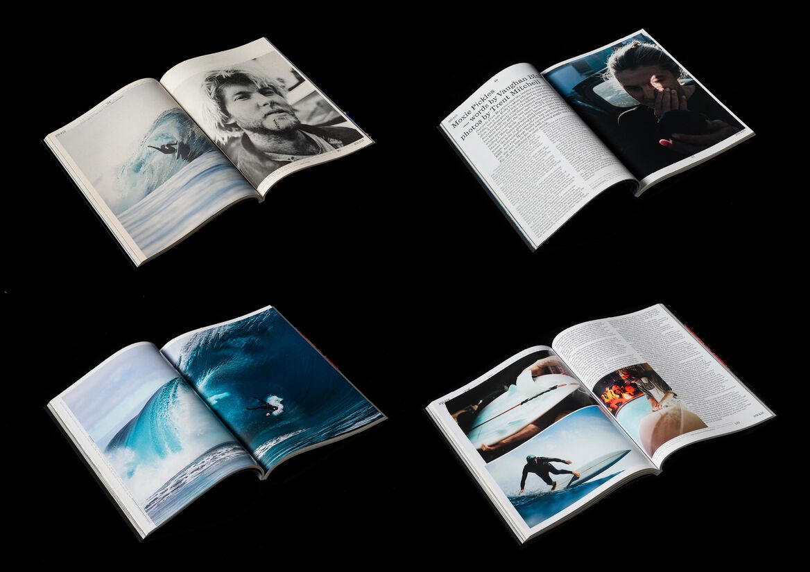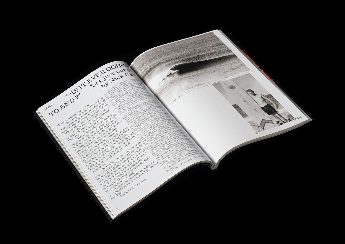 Now in its second year since our redesign, Surfing World magazine is slowly maturing – design wise as well as content wise. It's a grown up surf-magazine, looking back to the history of surfing, to the uncertain future underscored by the climate emergency and the changing nature of the once male dominated sport. It's a magazine that is as much about surfing as it is a voice of surf communities – political but not treading any particular party lines. The minimal typographic design and flexible grid that we have designed back in 2021 remains fully functional but 2022 saw a much more complex art direction with a stronger focus on imagery that speaks to current affairs as well. 2022 provided ample opportunities to put that approach to practice – from images of mud covered junior surfers during the NSW floods and their parents surfing waves of sewage water to surfers going off-grid during the COVID-19 pandemic to surf communities being obliterated by rising costal property prices the magazine is becoming more and more a mirror of the fast changing world through the eyes of the Australian and broader surf communities.
