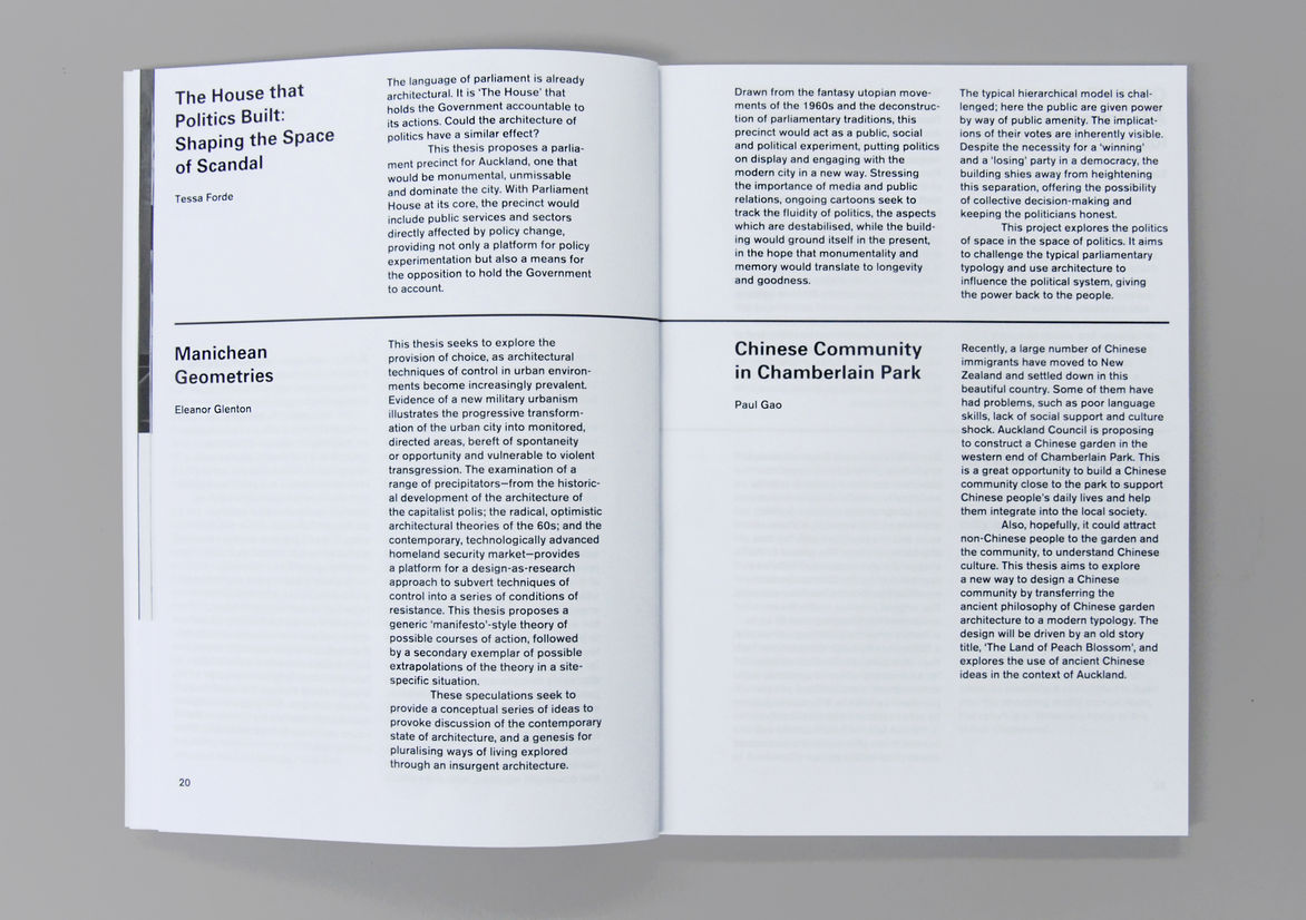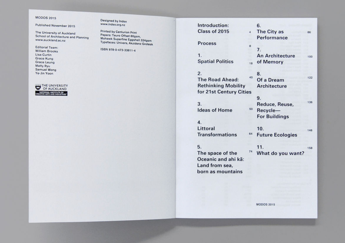 Graphic Business Communication Colour Award Graphics Design Communication Design Craft Editorial and Books Environmental Graphics Large Brand Identity Packaging Self Promotion Small Brand Identity Student & Academic Graphics Animation Digital Film Graphic Moving Image (archived 2025) Product Social Good Award Spatial Toitanga Value of Design Award User Experience Award (archived 2019) All categories Business Communication Colour Award Graphics Design Communication Design Craft Editorial and Books Environmental Graphics Large Brand Identity Packaging Self Promotion Small Brand Identity Student & Academic Graphics All years 2025 2024 2023 2022 2021 2020 2019 2018 2017 2016 2015 2014 2013 2012 2011 2010 Studio A-Z Index 16 MODOS Finalist 2016 Editorial and Books Credits Pou Auaha / Creative Director Amy Yalland Ringatoi Matua / Design Director Amy Yalland Ngā Kaimahi / Team Member Jonty Valentine Client University of Auckland, School of Architecture & Planning
