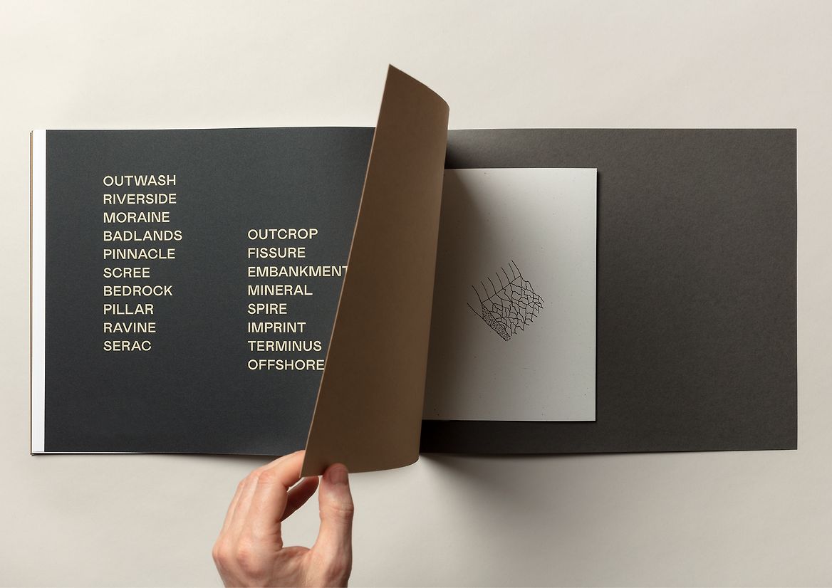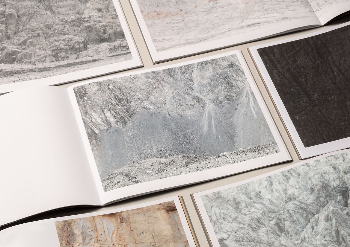 TEMPORAL presents a contemporary photographic survey, documented over five years that spans across fault lines, islands, and coastlines throughout Aotearoa. Imposing landforms and outlines of mountains and tidelines are pictured–inviting us into these formidable sites. Delicate facades, rendered in acute precision via the photographer’s lens, reveal geologic timescales, climatic weathering, tectonic uplift and glacial drift, etched into a landscape in flux. The brief was to produce a photobook as an object of beauty, yet within specific budget constraints, without compromising on the quality for the photo plates. The self-published, limited-edition photobook (125 copies) was produced to accompany the photographer Johnny McCormack’s exhibition; also titled TEMPORAL, that employed an aligned visual identity system throughout aspects of the photobook and the exhibition collateral. Printed locally in Tāmaki Makaurau using three different printing processes, including screen-printing on the cover and text pages, it was then hand assembled and bound by McCormack using pamphlet stitch with linen thread. The paper choice, specifically the colour tones, and gsm were carefully selected, with a total of five environmental grade paper stocks used throughout. There is a fold-out concertina insert, that reveals ephemera from the photographer’s archive, a reinterpreted geological topographic survey map of fault lines across Aotearoa from GNS, text by artist and rockhound Meighan Ellis, an illustrated cross section of a glacier, and a Whites Aviation photographic record of an expedition on Kā Roimata o Hine Hukatere, Franz Josef Glacier, taken in the 1930’s, from Te Puna Mātauranga o Aotearoa, Alexander Turnbull Library. The wide format and small margins allow the photographic plates to be undisrupted, the scale, proportion and weight of the photobook was also a significant consideration to allow the pages to be flipped through effortlessly, yet large enough to showcase and settle on an individual landscape as it opens completely flat, preventing any image loss due to tight binding or gutter disruption. The design and sequence of TEMPORAL was fundamental, the subtle narrative reveals deep time and as a journey across the Te Ika-a-Māui and Te Waipounamu unfolds, the reader is drawn in to slowly scrutinise these meticulously detailed landscapes.