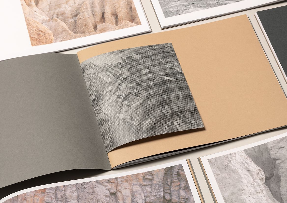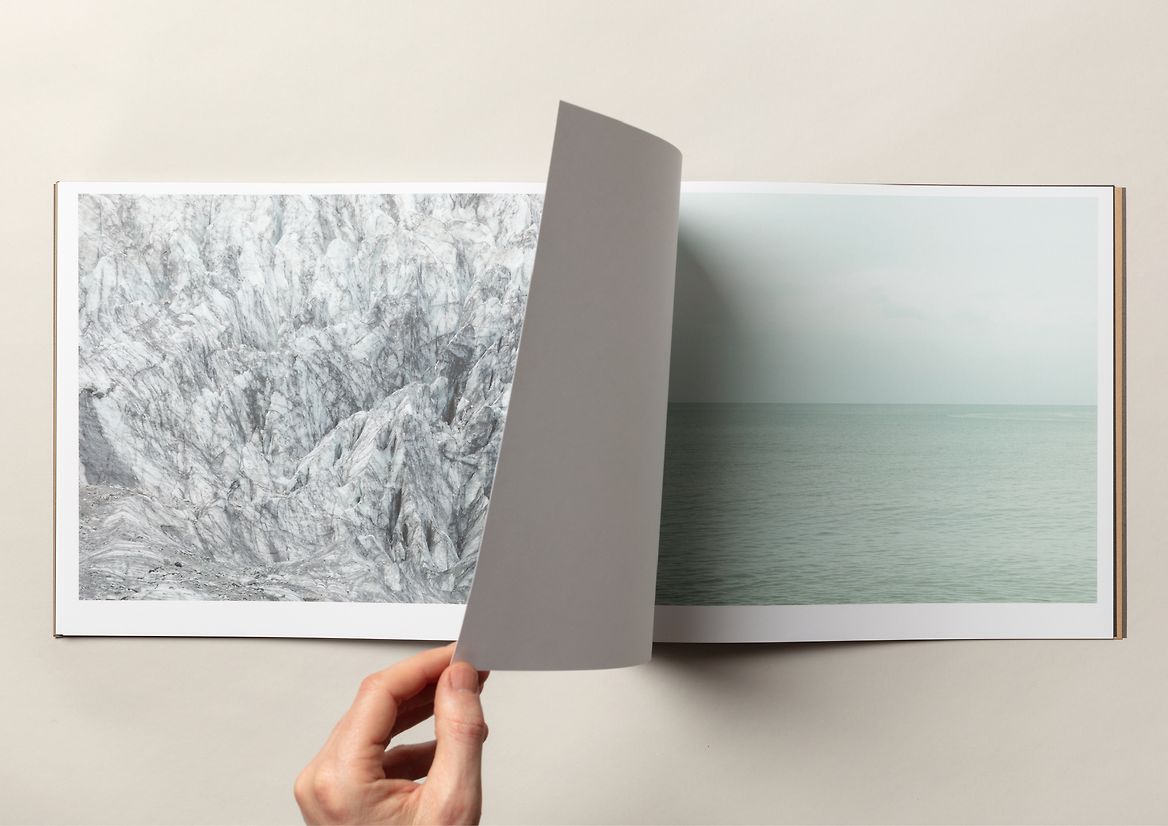 The wide format and small margins allow the photographic plates to be undisrupted, the scale, proportion and weight of the photobook was also a significant consideration to allow the pages to be flipped through effortlessly, yet large enough to showcase and settle on an individual landscape as it opens completely flat, preventing any image loss due to tight binding or gutter disruption.