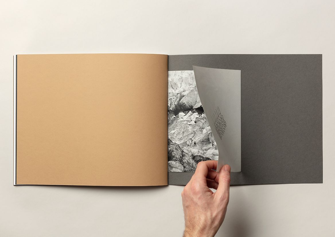 Printed locally in Tāmaki Makaurau using three different printing processes, including screen-printing on the cover and text pages, it was then hand assembled and bound by McCormack using pamphlet stitch with linen thread. The paper choice, specifically the colour tones, and gsm were carefully selected, with a total of five environmental grade paper stocks used throughout. There is a fold-out concertina insert, that reveals ephemera from the photographer’s archive, a reinterpreted geological topographic survey map of fault lines across Aotearoa from GNS, text by artist and rockhound Meighan Ellis, an illustrated cross section of a glacier, and a Whites Aviation photographic record of an expedition on Kā Roimata o Hine Hukatere, Franz Josef Glacier, taken in the 1930’s, from Te Puna Mātauranga o Aotearoa, Alexander Turnbull Library.