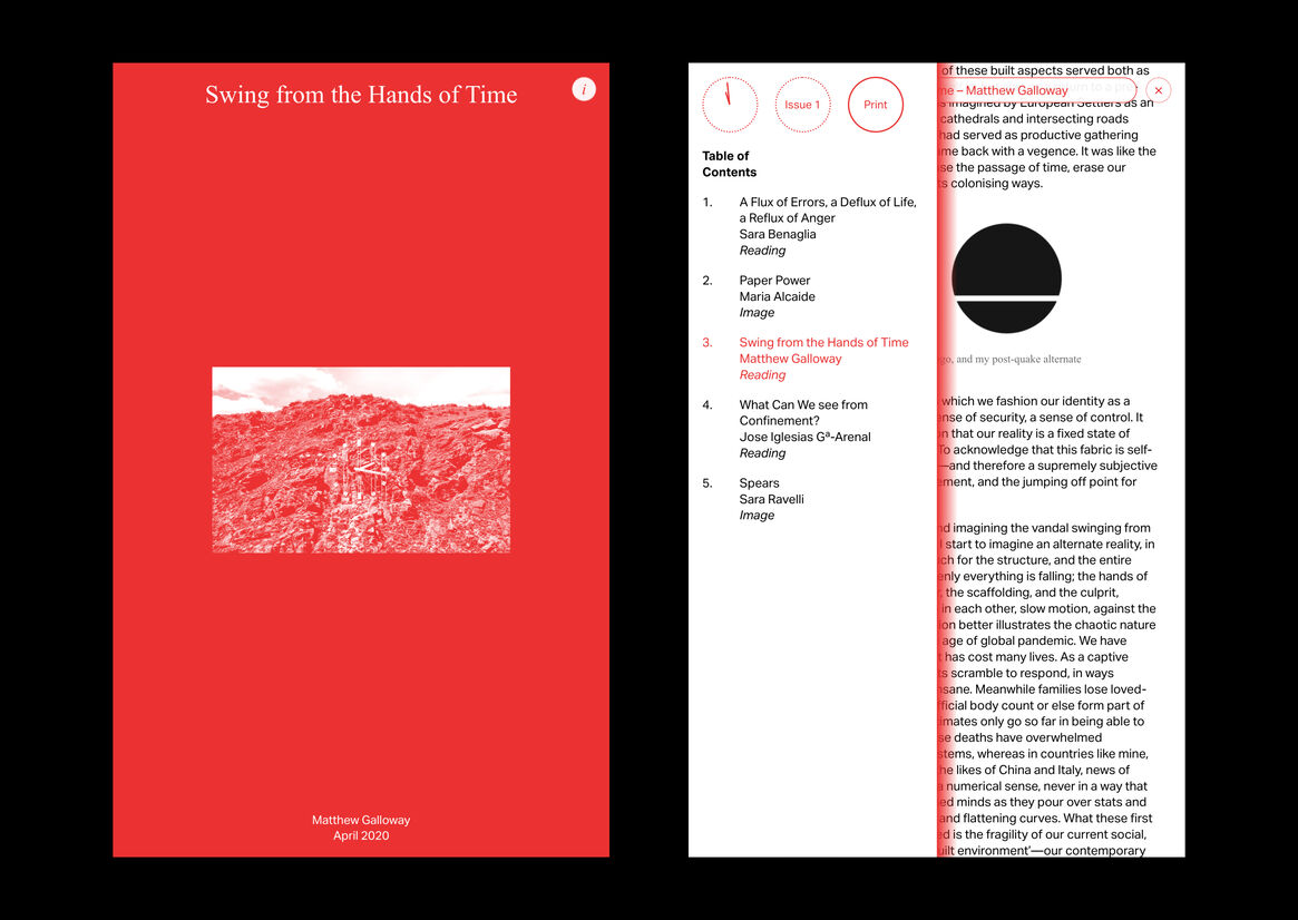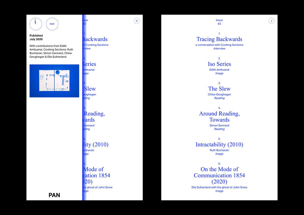 Pan was founded as a venue for new writing and artwork to exist and be shared in a way otherwise impossible given the restrictions put in place in response to COVID-19. From this starting point, the project has grown into an experiment in forms of distribution. Each issue of Pan consists of approximately 5 text or image-based contributions from writers, artists and designers. Each issue is released via multiple channels; on pan-publication.org, as a downloadable, print-optimised PDF from the website, and then finally as a limited edition, physical printed publication in an edition of 250. As a result, the project looks to examine the dynamic at play between content readily available digitally, and the more concrete, scarce form it might take in print. The digital capabilities of the project also allow for each issue of the publication to build slowly online, as contributions are ready. This responsive aspect of how the website has been developed opens up interesting editorial and design possibilities, as contributions within a single issue of the publication can respond to each other, and develop organically.