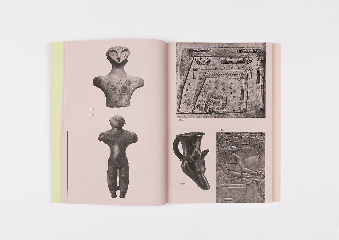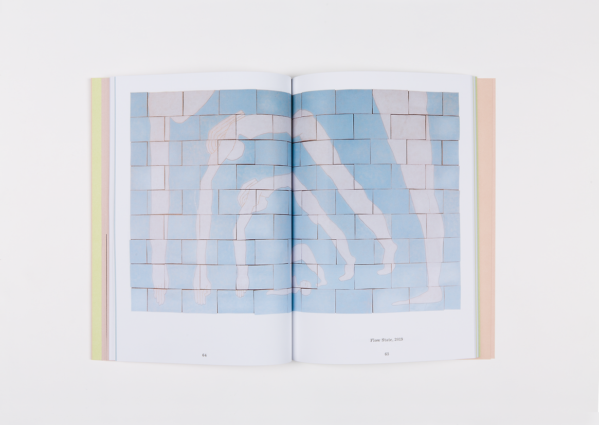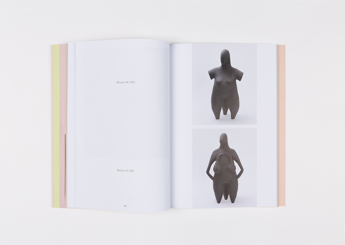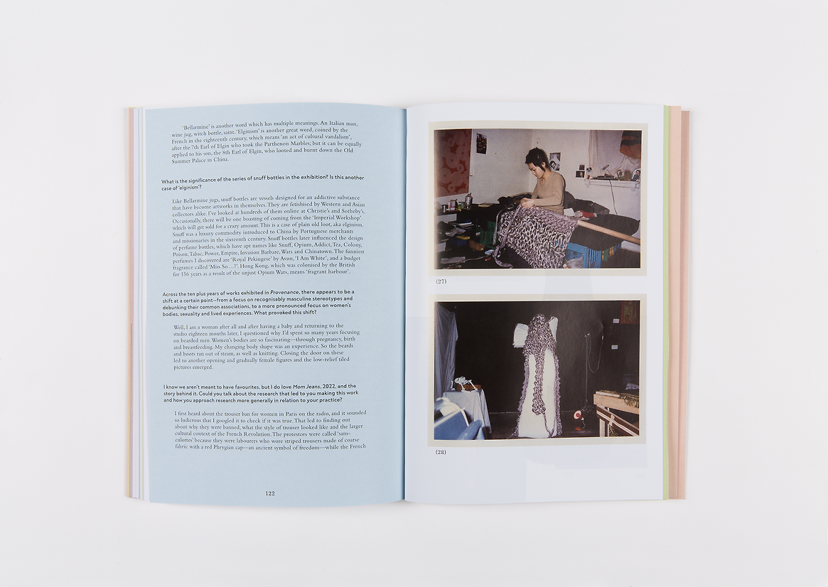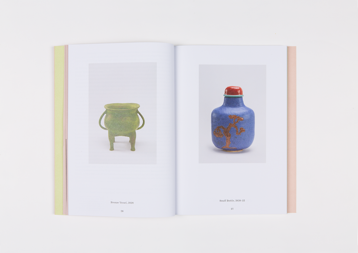As interpretations of objects and artefacts from around the world, So’s works have the appearance of being both ancient and contemporary. We approached the design by incorporating a visual index to the artist’s historical sources at the front of the book, with cut-out objects and images that resemble the plate sections of early twentieth-century museum catalogues and encyclopaedic reference books. We used a long fold-out cover with full-page images to lend So’s objects a sense of monumentality and scale (like classical sculpture), giving readers a sense of immersing themselves in the artist’s world. We gave the front cover’s charismatic figurative vessel a clear spot varnish with a grain texture that evokes the tactility of an unglazed pot. The saturated pastel colours that cycle through the book (cover and interspersed text sections) echo and complement the flat colours of the artist’s cartoon-like ‘knitted paintings’ and ceramic glazes. We chose to give each of So’s artworks a strong singular presence by reproducing them on their own in full colour, or in pairs that convey the way that she works with repeated ideas and motifs.