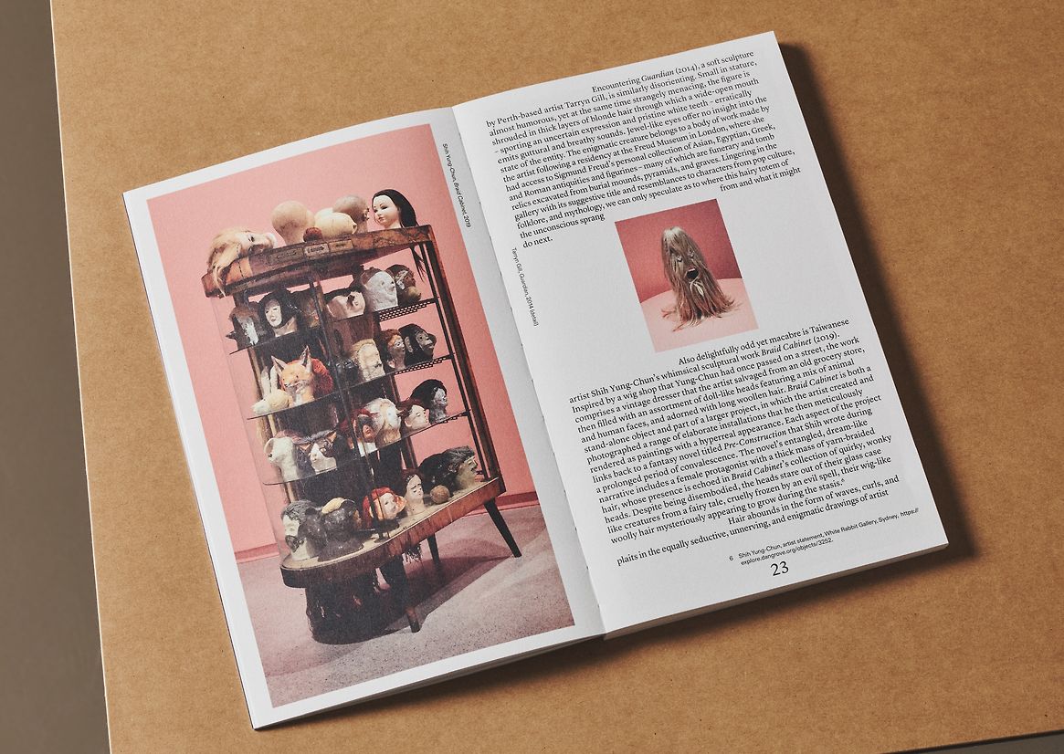 Published to document the 2024 exhibition that preceded it at Heide Museum of Modern Art, Hair Pieces explores the complex significance of hair in contemporary culture through a selection of recent Australian and international works of art. Edited by Melissa Keys and published by Perimeter Editions, the book encompasses a wide range of practices, including drawing, painting, performance, photography, installation, text, and more. As such, this collection of works reveals interwoven dialogues tracing identity, spirituality, agency, and resistance. The book – which works to examine the myriad ways in which artists utilise hair to investigate and conjure generative possibilities for growth, empowerment, and transformation – was designed to play the role of an unofficial catalogue for the exhibition, and an autonomous publication in its own right. The idea anchoring the design treatment was to play the dual role of generously documenting the exhibition, while also allowing the book to read as a contemporary design object. The design concept plays with visual ideas of entwinement. The elongated forms of plaits and braids are articulated through the book’s tall and slim proportions, while the humble size was in keeping with Perimeter’s accessible ethos and its market positioning as an illustrated text/reader. This concept of entwinement is imbued in the cover typography, where elongated serifs cause that the letters to merge. On the inner pages exaggerated indents and alignments across the book’s essays, create lacing typographic rhythms, intended to evoke connotations plaiting. A Coptic bind was employed, for its ‘hairy’ qualities, while the title was printed on the exposed spine. The book’s content is diverse in its bearings, spanning painting, sculpture, installation, photography, film, and various other media, alongside installation views, extensive essays, creative and poetic written commissions, and more. The works are at once radiant and repellent, and richly symbolic, bouncing between the corporeal, personal, and political.