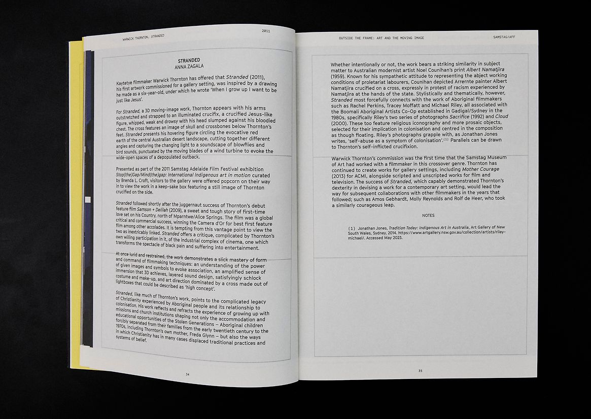 Typography plays a crucial role in the book's identity. Employing Cinetype – a font originally engineered for cinema subtitling machines – the font is notable for its absence of curves. To introduce each artist, the design takes a didactic approach by using the credits from each commission. While major, newly commissioned essays are distinguished by vibrant yellow pages, inspired by subtitle colours in films. The cover sees a prosaic choice of materials countered with bold typography. On the spine, a full list of the nineteen artists and their commissions are featured.