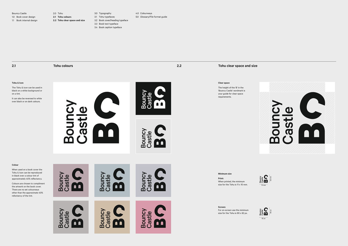 The tohu/mark: The flippant name Bouncy Castle might seem to contradict the imprint’s intent. We adopted the oxymoron ‘serious fun’ as a design guide. We wanted the tohu to be an integrated part of the design system, so built it with a typeface that could be used within the book. Klim Type Foundry’s Calibre was chosen as a serious font that with a little encouragement could also look playful. Turning the ‘B’ on its back and placing the ‘C’ directly above it, and titling it, created the illusion of bouncing—and a perfect, simple monogram for book spines. The full tohu adds the wordmark turned on its end—looking like a small typographic castle. There are no set colourways for the tohu, other than being mostly black or white over a colour ground.