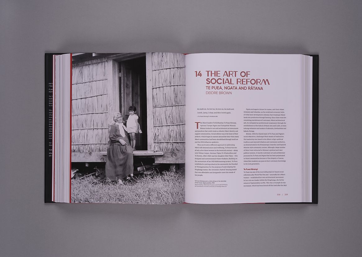 At the centre of the design vision for Toi Te Mana is the unique Māori typeface – Mana – designed specifically for this publication. This font is part of an ongoing typographic journey within the design practice. The whakapapa of Mana began in 1993, when a plaque design for the John Bevan Ford sculpture Ko Kupe took inspiration from letters Māori used on pou (posts) and heke (rafters). In 2001 the 6 hand-drawn letters were expanded into a complete alphabet forming the celebrated Parihaka typeface. For Five Māori Painters (2014), the high-contrast type design was transformed into a square, straight-edged, inline serifed font – inspired by the negative space in Kāi Tahu rock art, and the haehae of toi whakairo. 2018 saw a slab-serif style introduced for whakataukī in the Te Papa Ōtākaro/Avon River Precinct Literary Trail.