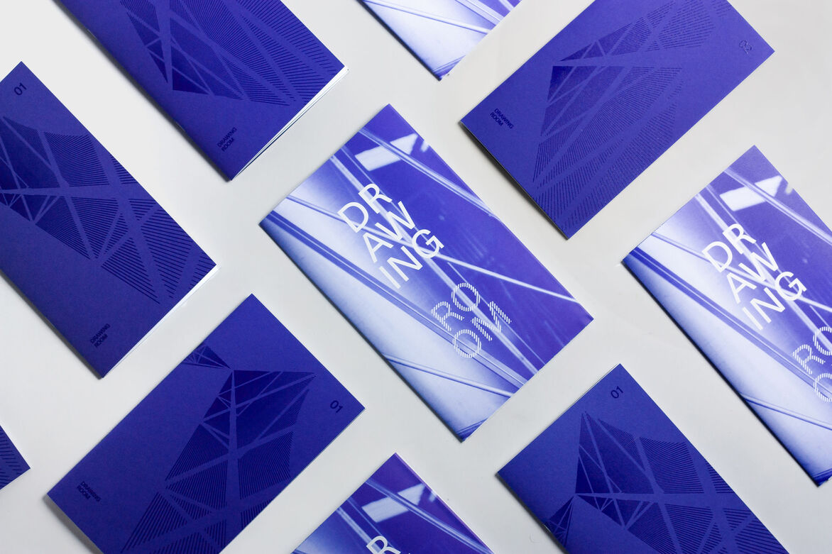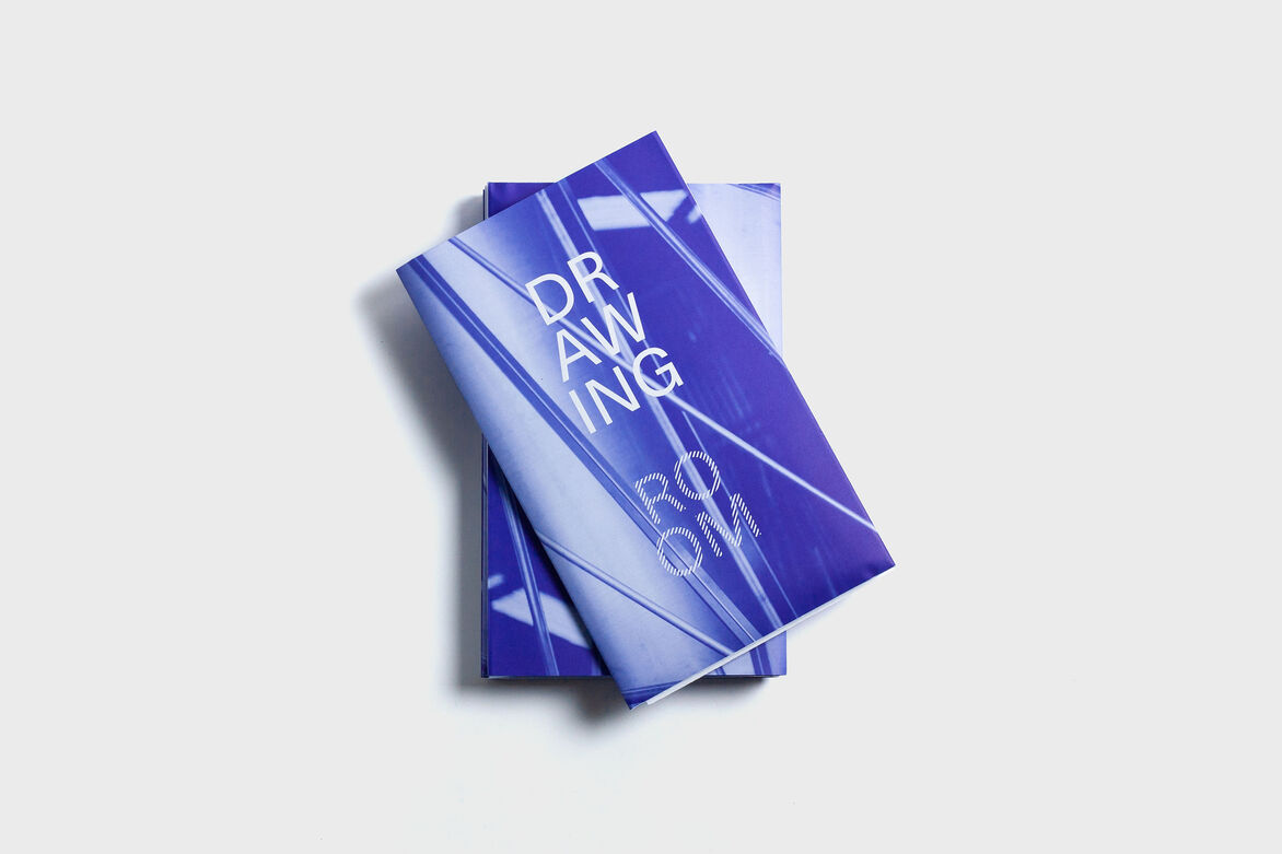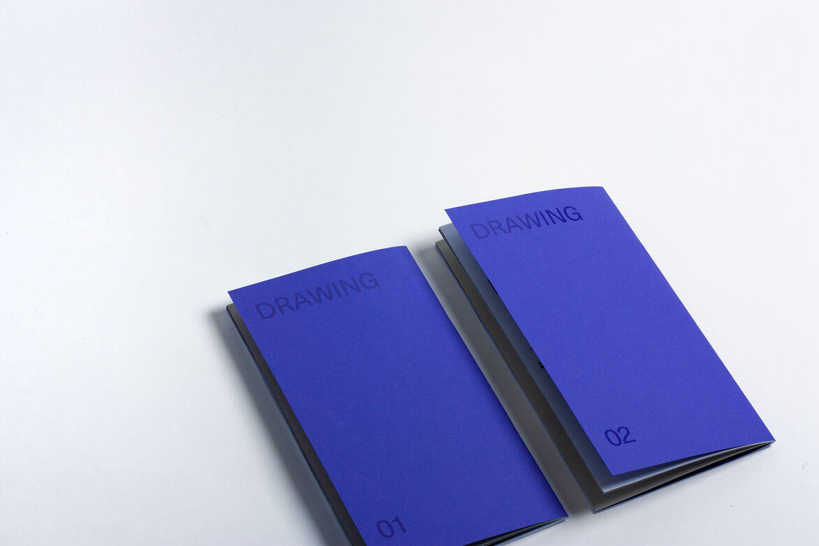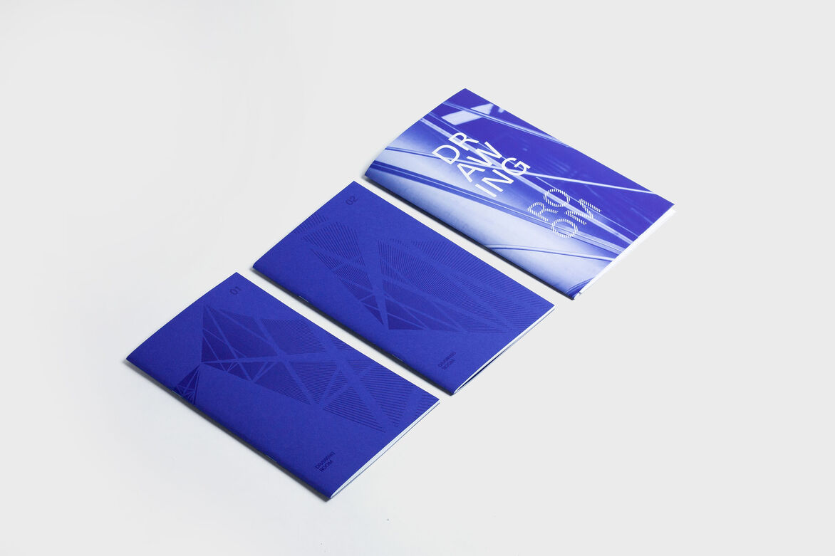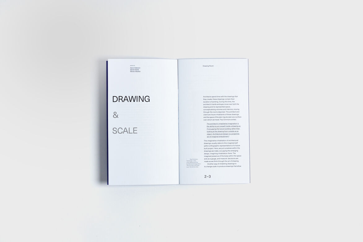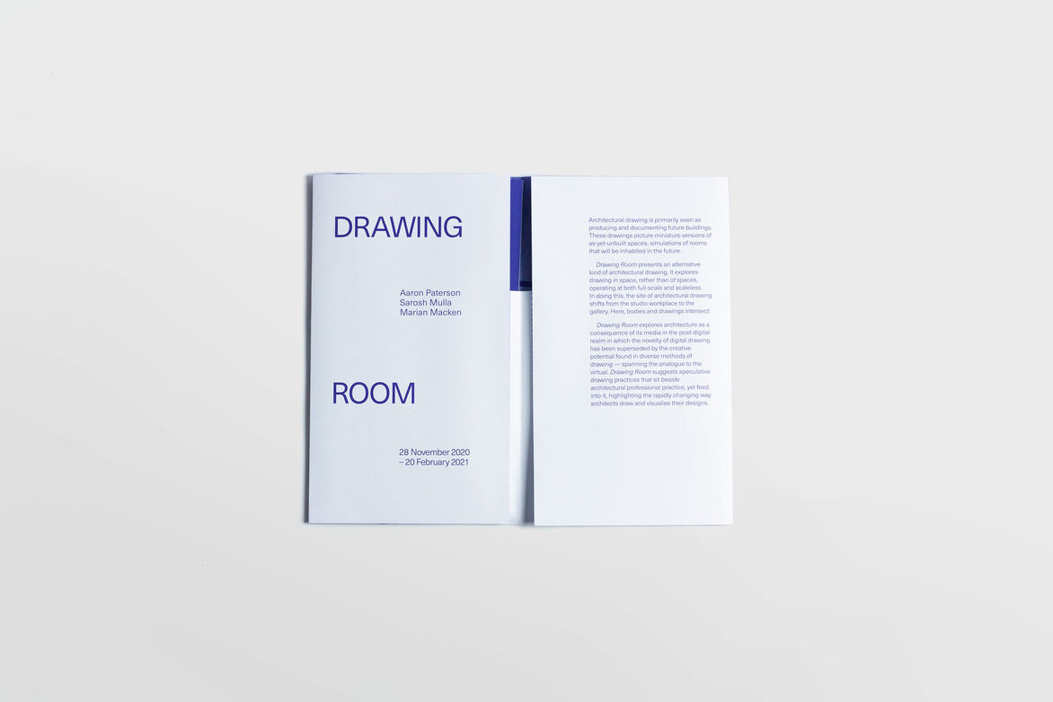 Drawing Room, the publication, utilises the exhibition floor sheet in the form of a wraparound dust-jacket, enclosing a pair of booklets. Each booklet contains an edited selection of essays, reviews, and documentary images focussing on the three themes of the exhibition: drawing and scale; drawing and simulation; drawing and light. Text contributions by the editors and reviewers are interspersed among documentation of the VR component of the exhibition and photographs of the installation — both in situ and throughout its construction.