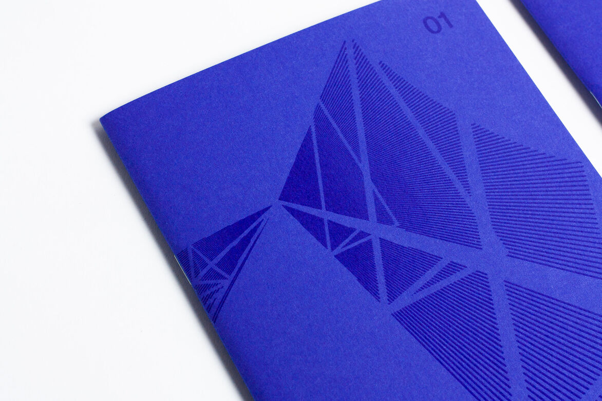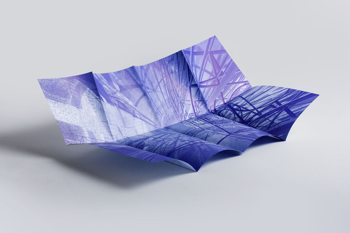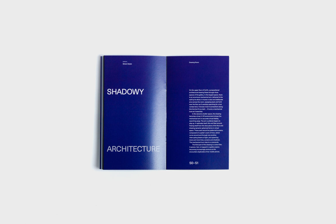 The connection between commercial practice drawing of space and artistic practice of drawing in space also played a key role in the shaping of the publication's visual identity. The vibrant blue spot colour printing and cover stock draw a connection to the hues in the colourful VR world presented in the exhibition while also referencing the existing branded material of the architects' commercial practice and creating a bold visual appeal.