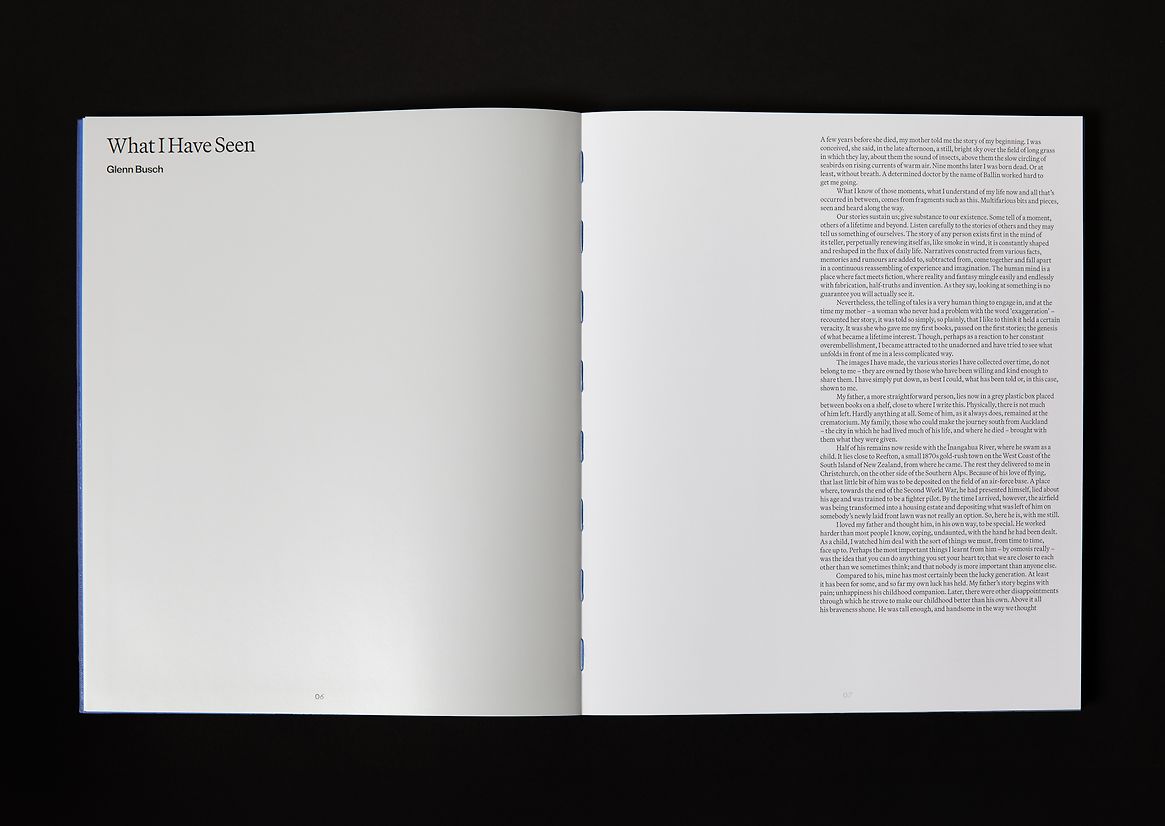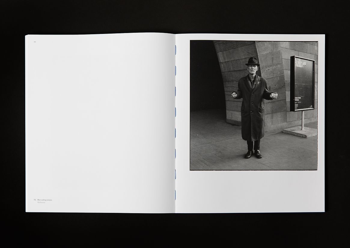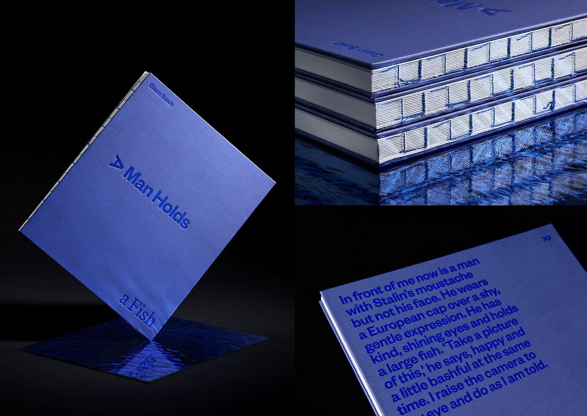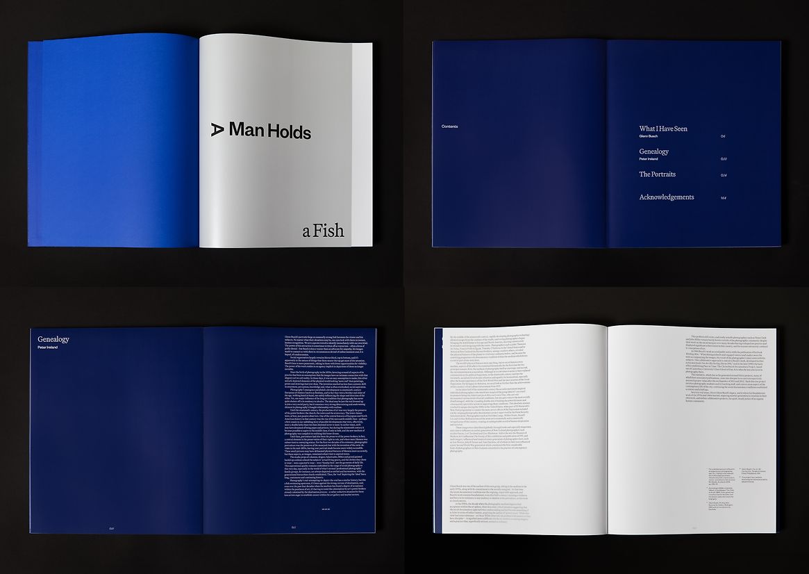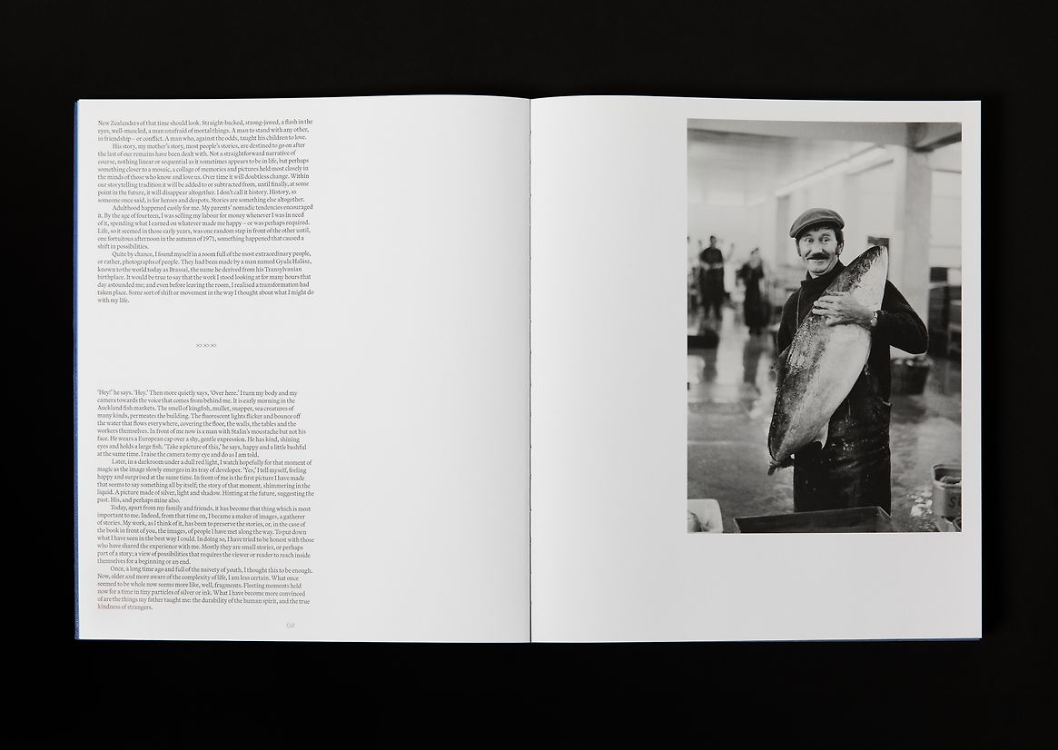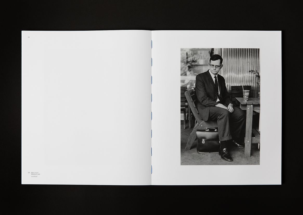 A Man Holds a Fish introduces the work of Glenn Busch, a renowned New Zealand photographer known for his raw, human portraits. The design honours his candid approach, with images pressing to the page edges to echo the marginalised subjects he captured. Inspired by Glenn’s darkroom revelation, metallic silver ink adds depth, while subtle blues offset a restrained monochrome palette. The cover remains bare, typography pairs Sabon with Founders Grotesk, and exposed Smythe binding reflects the honesty of the work within. Every detail serves the photographs, creating a book that is quiet, unvarnished, and deeply respectful of its subject and its maker.