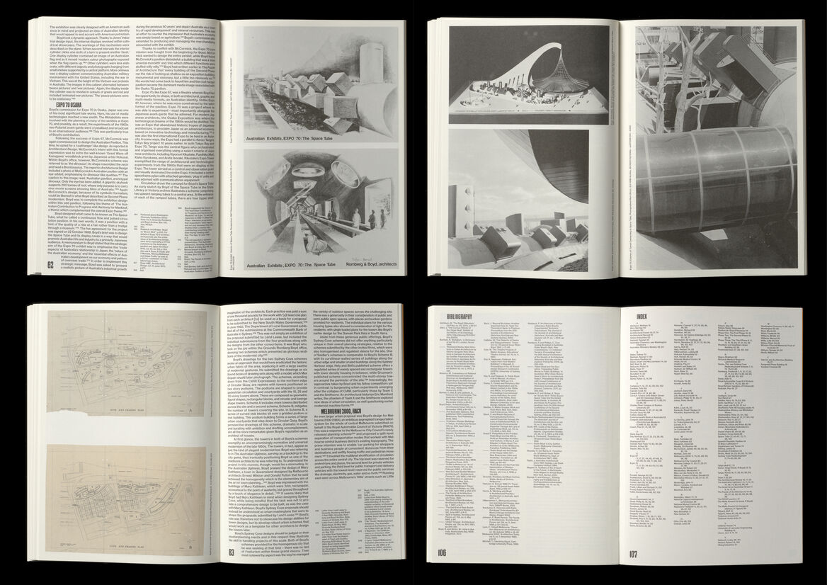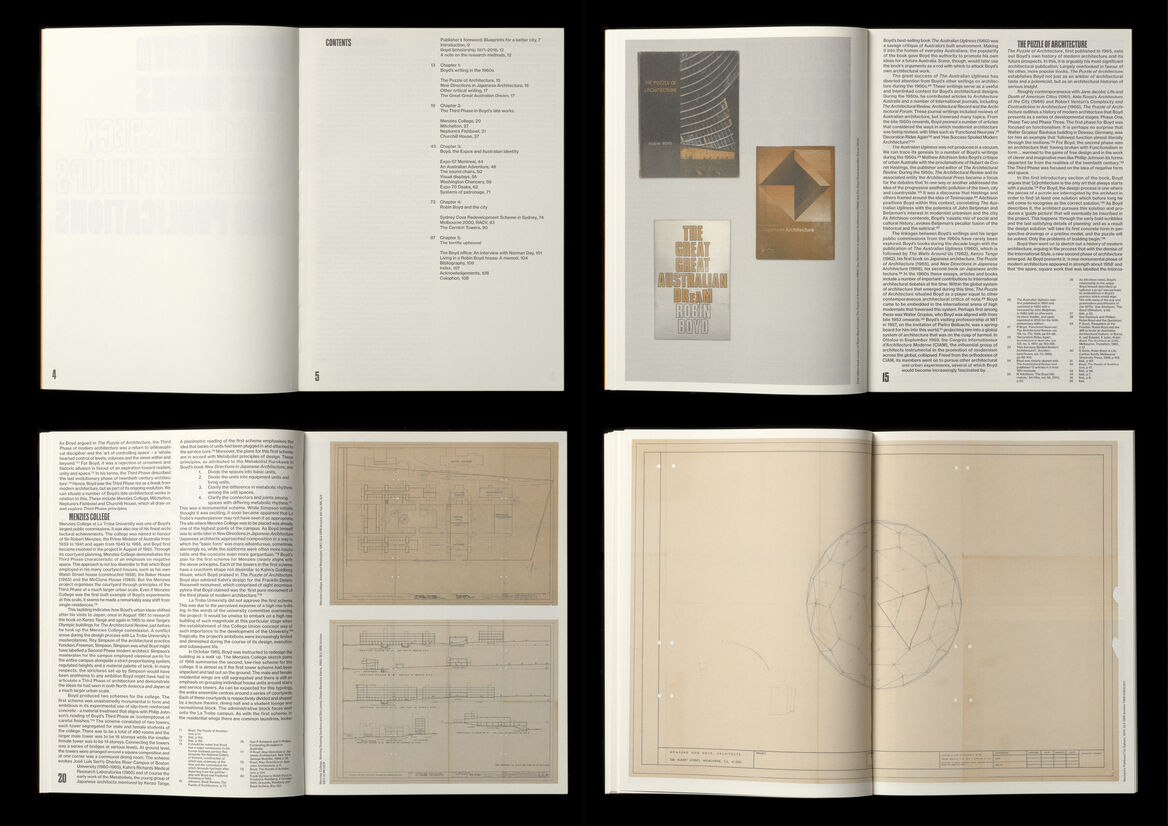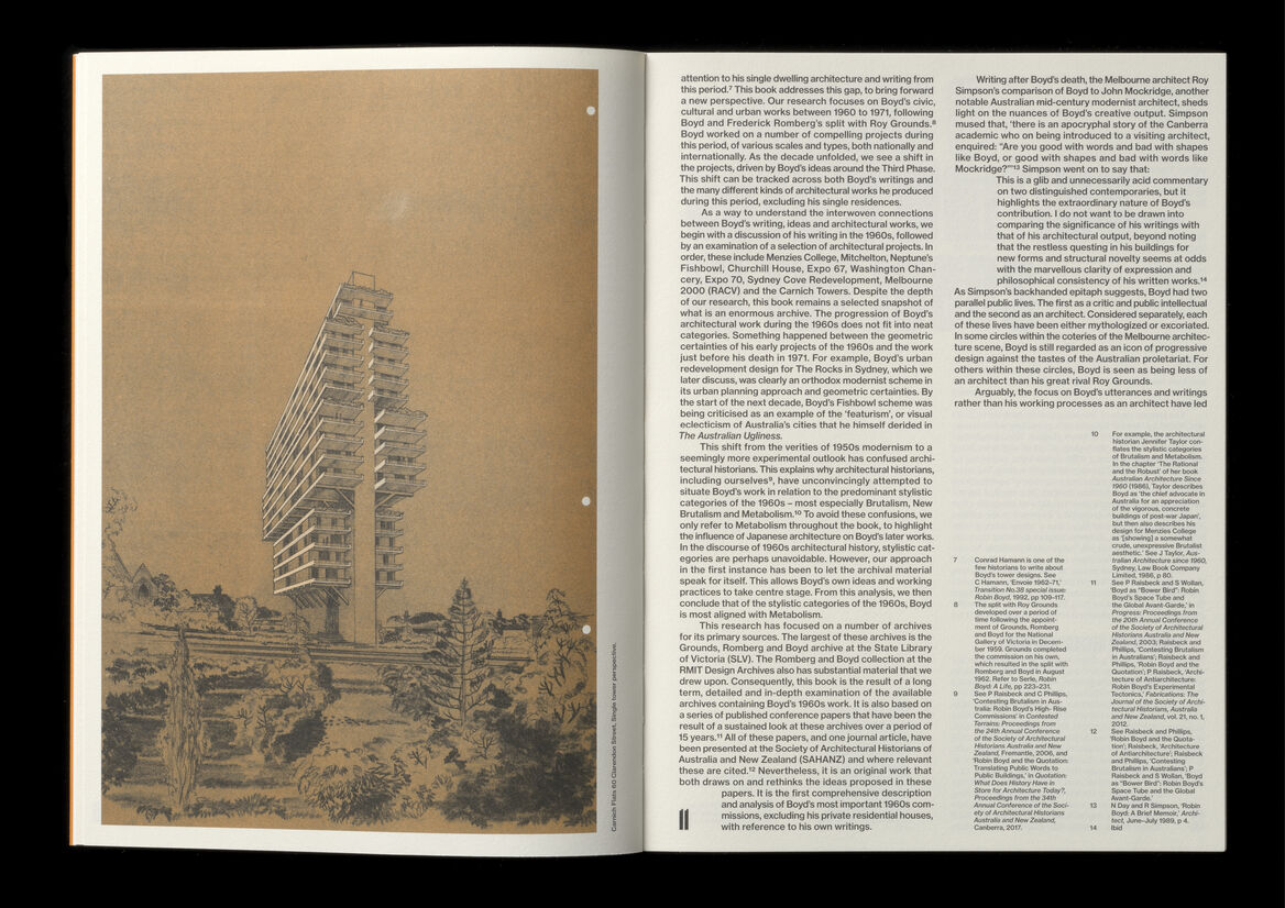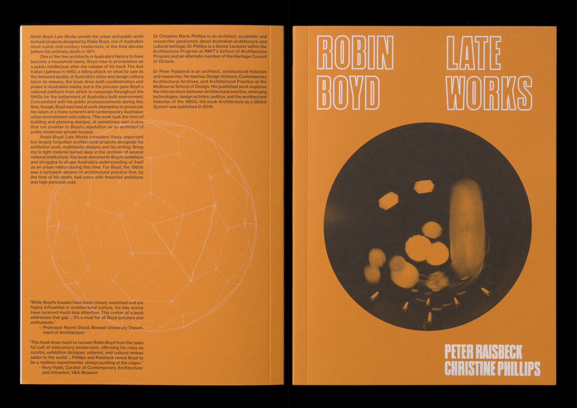 This book documents and discusses the under-scrutinised late work of key Australian Modernist Robin Boyd. Under-scrutinised because in its experimentation and scale it seems, to some, to undermine Boyd’s legacy. The book design is an amalgam of Boyd and period references, made now through a contemporary frame. A modesty of scale and means is at its core — a little over a hundred pages, paperback, and printed in two colours. But a systematic scale is also at heart here, with a complex grid and typography developed from Boyd’s Carnich towers, a key late project.