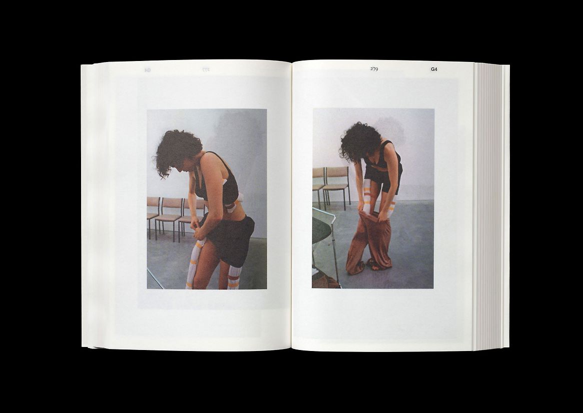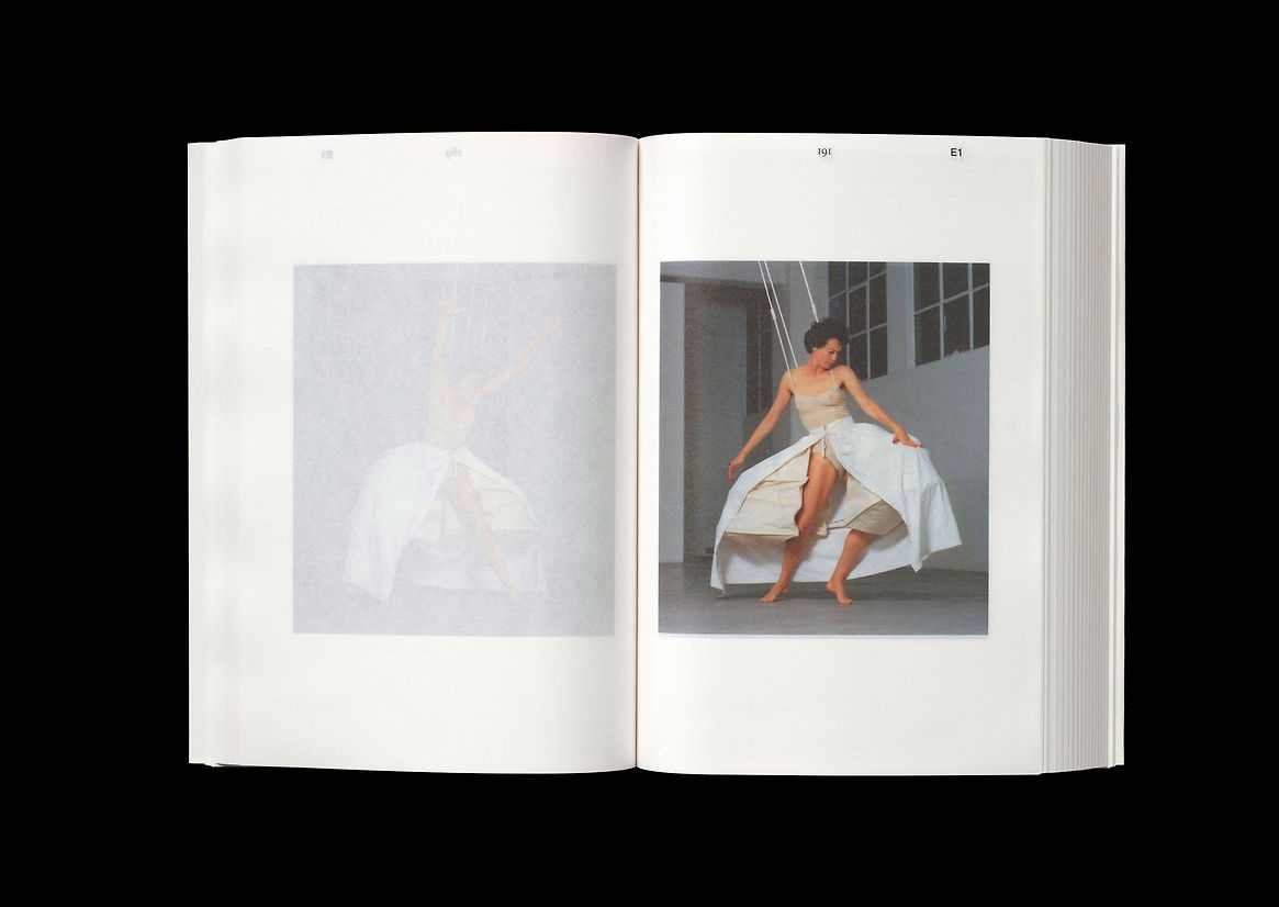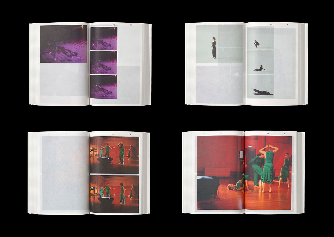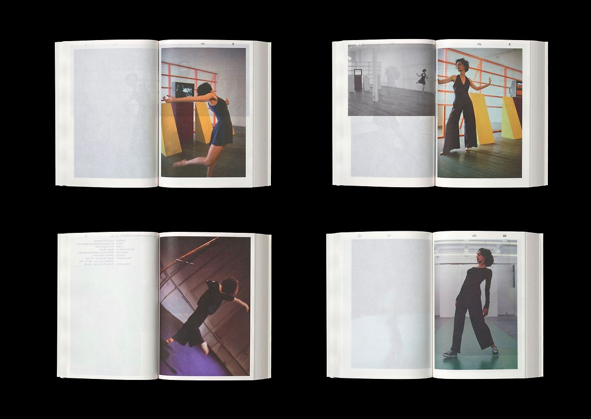 ... Beyond the difficulties of archiving dance in general, Lasica’s practice is uniquely elusive in character. The book’s designers address this with a deft minimalism. The book is both dense—a little over 700 pages—and compact—about B5—in size, its softcover enclosed by a dust jacket. It feels specific despite the expanse of its subject, and heavy despite the lightness of the paper. The typesetting bears a light touch, letting the images take precedence. The stock on the book’s cover is toothy and bright against the black ink of its dark cover image. This image shows a figure blurred by motion, mid-dance: barely there. We take this to be a performer, perhaps Lasica herself, but one unadorned by an elaborate costume or set...