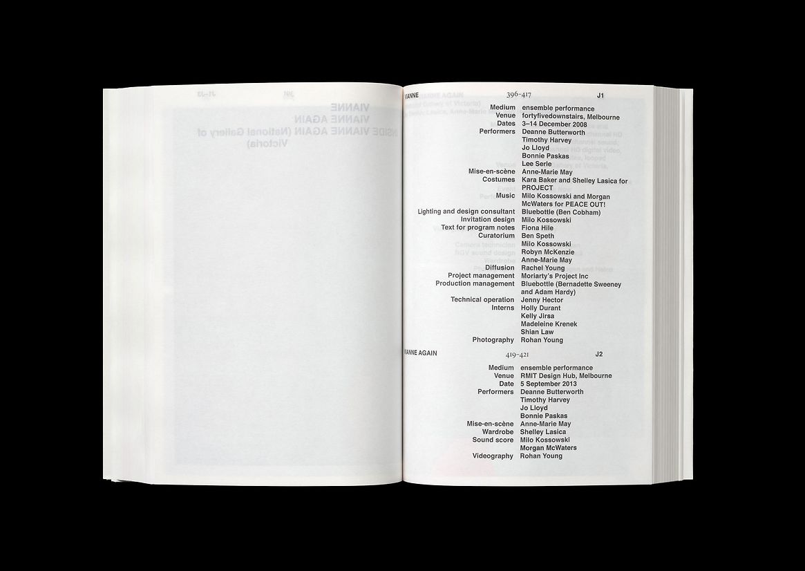 ... The main archival gesture of ‘WHEN I AM NOT THERE’ is the arrangement of a substantial image section reproduced from Lasica’s collection of material. The works are catalogued thematically and then indexed by an alphabetical code. Letters, marked in the top right of the image pages, correspond to each dance work. Multiple performances of the same work are also assigned a numerical designation: as in A1, A2, or A3, for example...