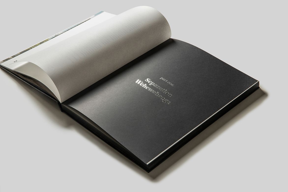 The enigmatic cover is followed by a sequence of 50 pages of initiation, and only then the full intended effect of the architecture is finally revealed to the reader. The content unfolds gradually over three parts, just like the three-stage sequence of all rites of passage. Part I– Separation describes the break from the past due to the disruptive earthquake; Part II– Transformation, is the liminal phase of creation, construction, and change; Part III– Return, is the incorporation of a new social identity marking the beginning of a new era. The frequent changes in paper stock, act as a tactile backdrop on which this ritual takes place.