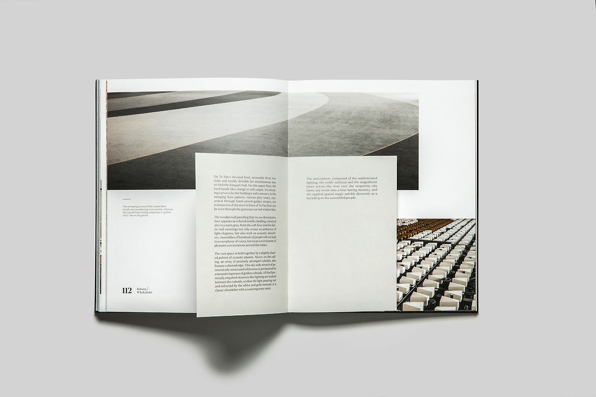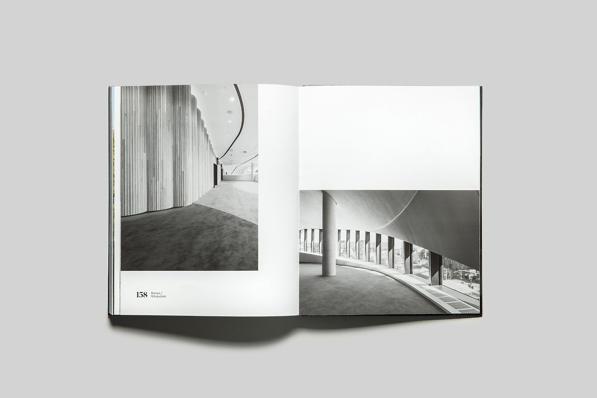 Through its elegantly designed pages, the book seeks to delight and transport the reader to Te Pae; a landmark embodying the island’s stunning natural beauty and diverse cultural values. To capture this, it has been created with thoughtful design details, curated photography, and an emphasis on materiality. The different papers, textures, finishes, and treatments reflect the diversity of the building’s materials and give the reader an in-depth insight into the sophistication and craftsmanship of Te Pae. Book and building become a unified experience. Its fluid composition –following the rhythm of the building’s undulating façade– is a tactile and visual interplay among vivid photography, collages, small monochromatic page insets, die-cuts and silver foil details.
