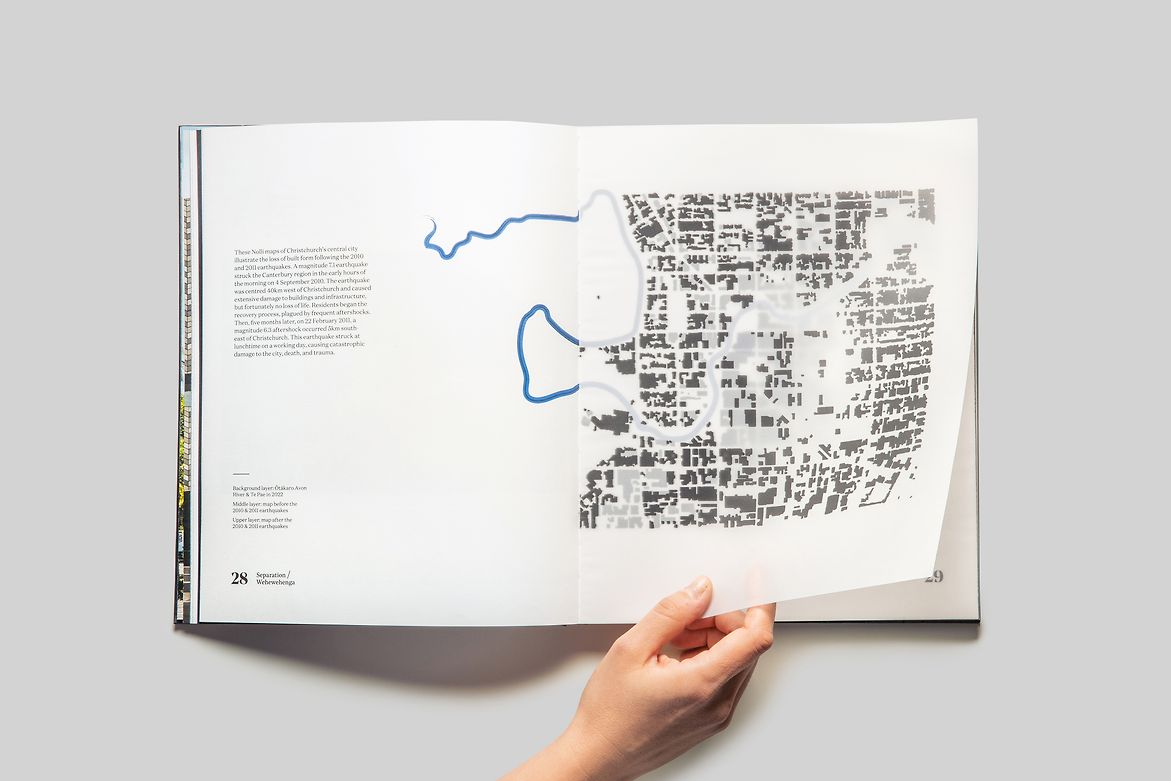 This limited edition book on Te Pae is celebrating the building, the land that precedes it, and its people. The book's narrative has been designed as a rite of passage, marking the collective transition from grief and rubble to urban beauty. All of its components and design details are imbued with symbolism and meaning, interweaving this ritual into the materiality of the book.